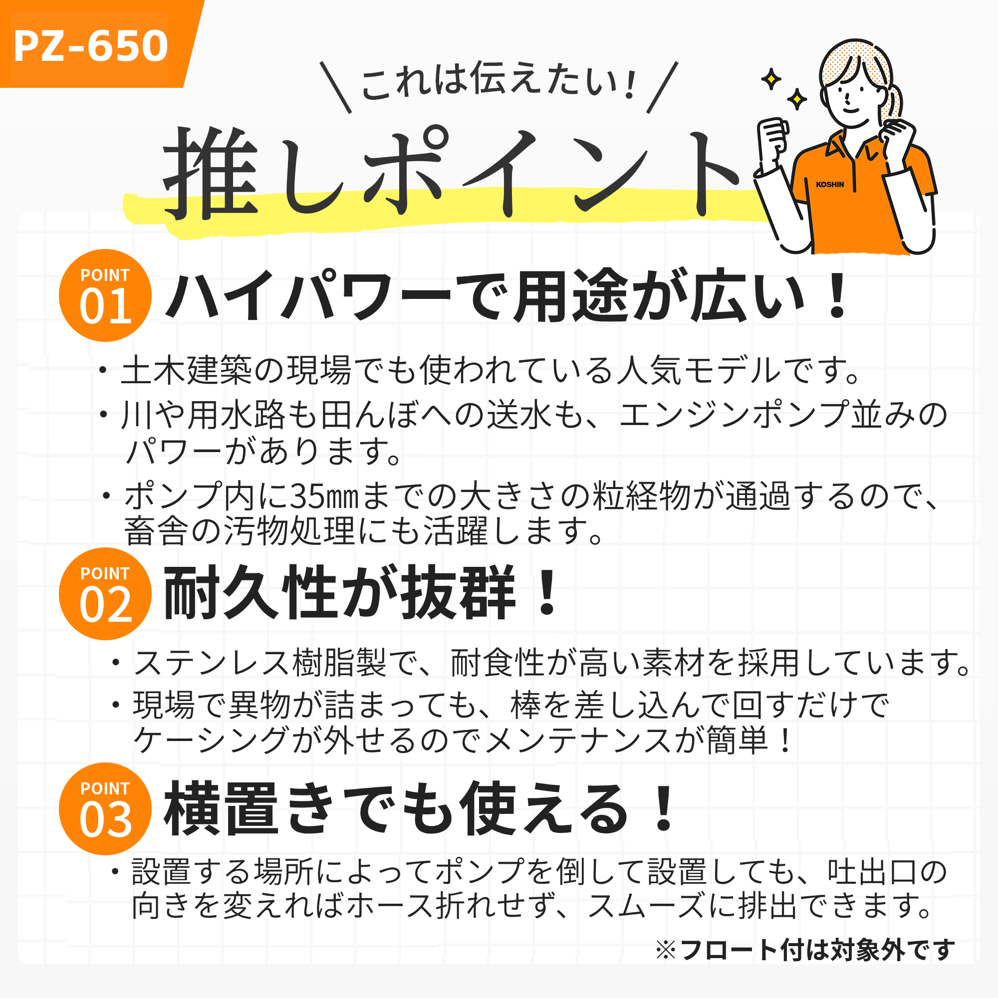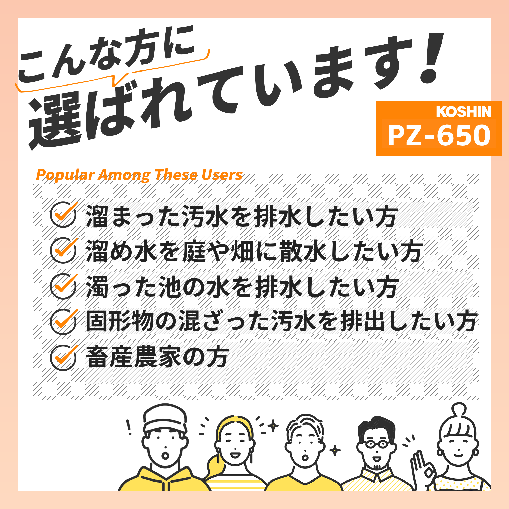 | 備考 | "※1:本機は5~40℃の【清水】・【簡易汚水】・【汚水】・【簡易汚物】・【汚物】専用です。 それ以外の水質、または塩水、油、溶剤、薬品、酸性やアルカリ性の液体などを使用した場合は保証対象外となります。 ・【清水】とは、水道水、農業用水、井戸水などのうち、濁りのない水を指します。 濁りの無い水でも飲料水や食品用には使えません。 ・【簡易汚水】とは、水道水、農業用水、井戸水などのうち、濁りのある水を指します。 細かい粒子の混じった水に使用すると、ポンプ寿命が著しく短くなります。 ・【汚水】とは、水道水、農業用水、井戸水などのうち、(土砂を含む)濁りのある水を指します。 細かい粒子の混じった水に使用すると、ポンプ寿命が短くなります。 ・【簡易汚物】とは、10㎜以下の固形物(やわらかいもの)を含んだ、水分90%以上の水を指します。 吸い込み可能な固形物サイズは機種によって異なります。 土砂・スラリーの混じった水に使用すると、ポンプ寿命が著しく短くなります。 ・【汚物】とは、10㎜を超える固形物(やわらかいもの)を含んだ、水分90%以上の水を指します。 吸い込み可能な固形物サイズは機種によって異なります。 土砂・スラリーの混じった水に使用すると、ポンプ寿命が著しく短くなります。" |