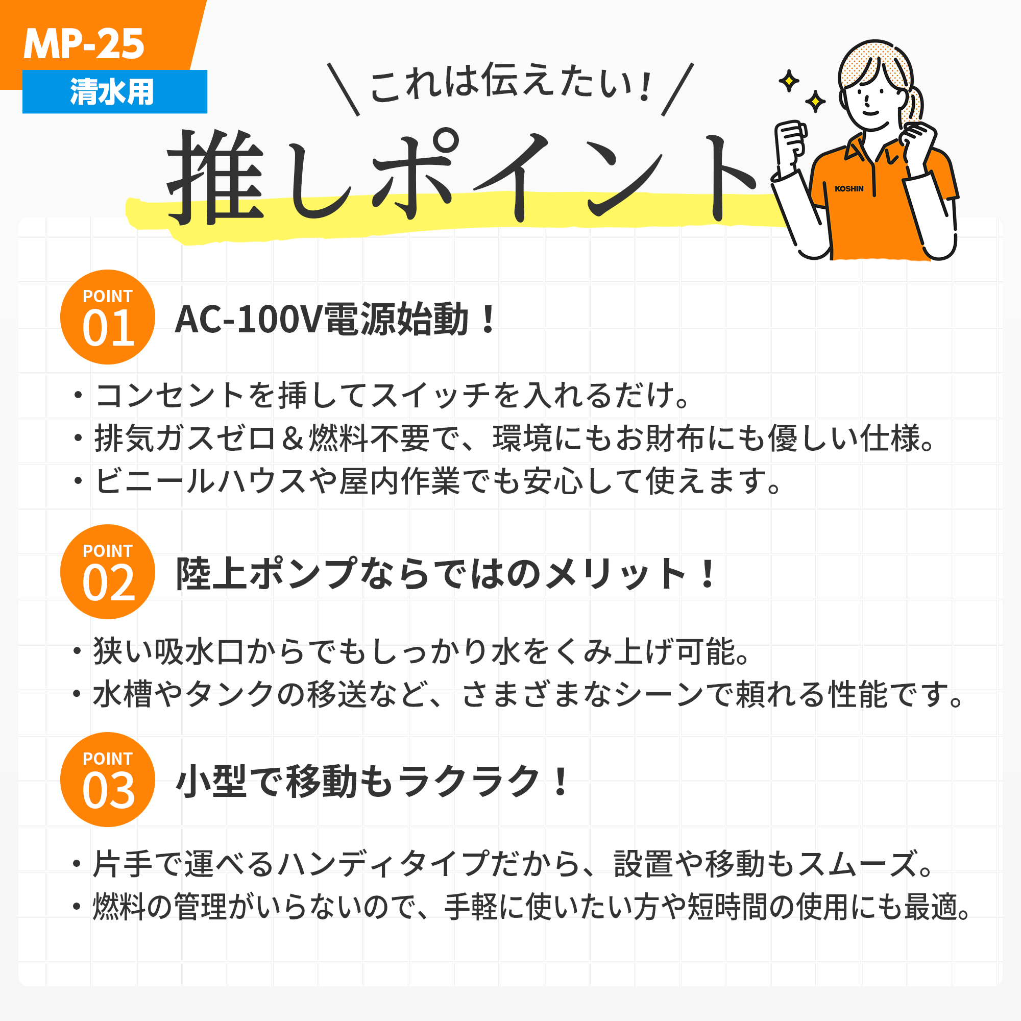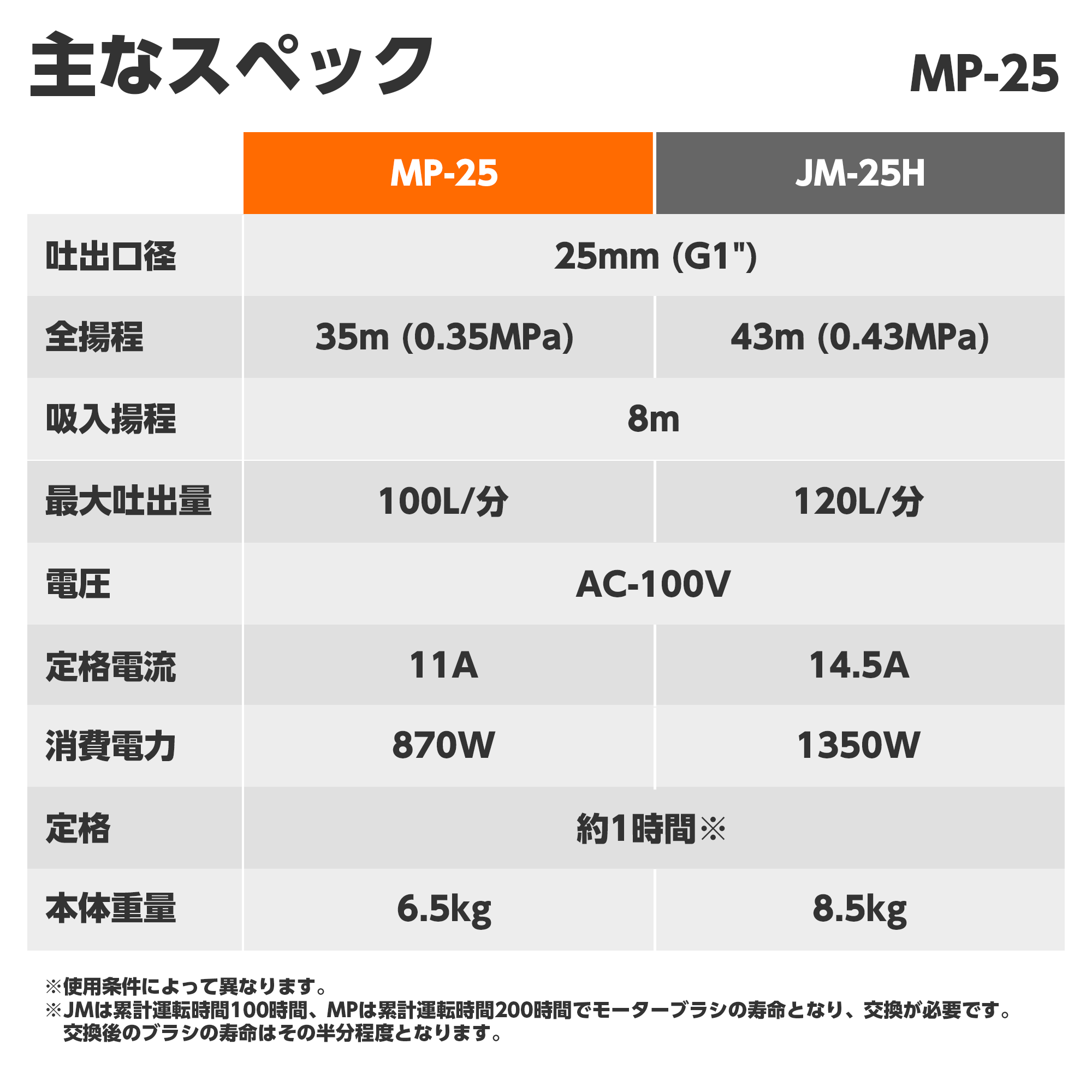| 付属品 | カップリングクミ (25x25 mm) 2セット、タケノコニップル (25x20 mm) 1個、タケノコニップル (25x15 mm) 1個、ホースバンド (25 mm用) 3個、ホースバンド (20 mm用) 1個、ホースバンド (15 mm用) 1個、ストレーナー 1個、カーボンブラシ予備 2個、ヒューズ予備 (15A) 1個、取扱説明書 1部 |