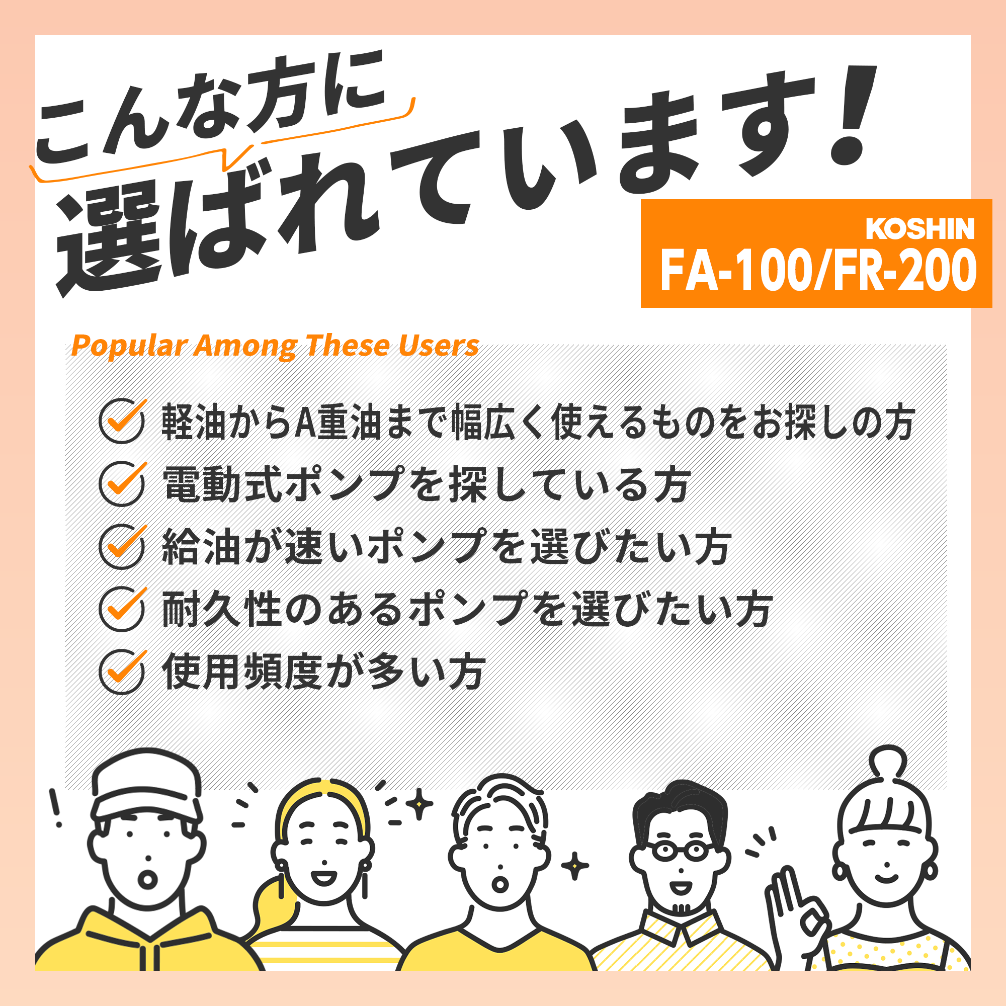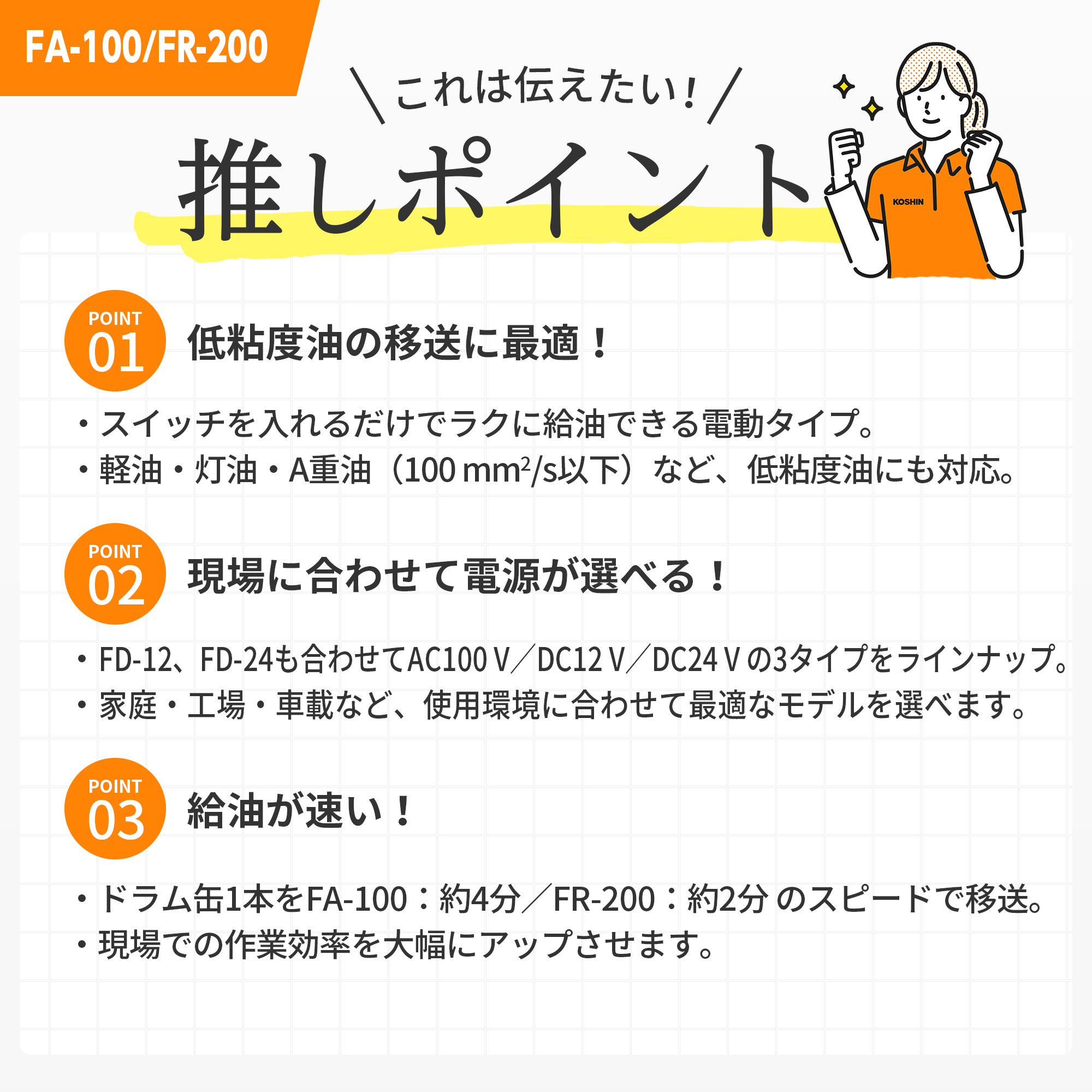 ●ドラム缶1本をわずか4分で吸い上げる高能率ポンプです。(FR-200は約2分です。)