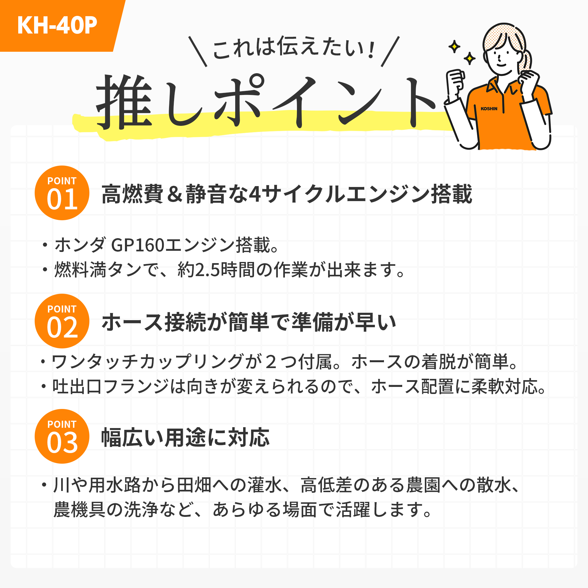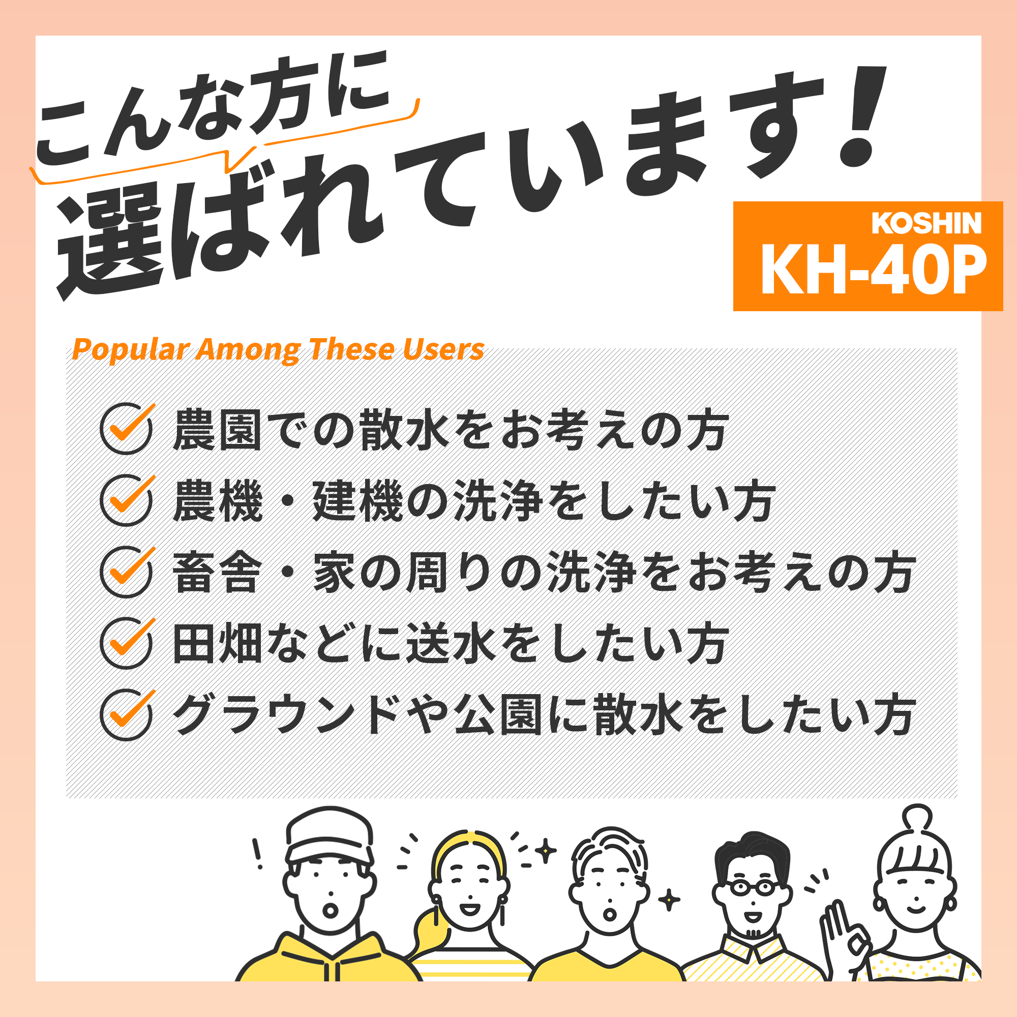 | 備考 | ※1:使用条件によって異なります。 ※2:このポンプは【清水専用】です。それ以外の液体を使用した場合には保証対象外となります。 ・清水とは、水道水、濁りのない井戸水・農業用水を示します。ただし、清水でも飲料水や食品用には使用できません。 |