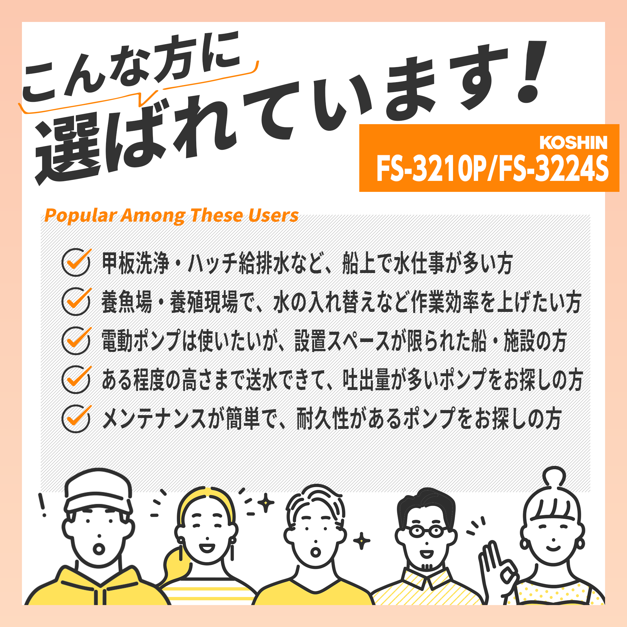 ●モーターは、耐塩処理モーターを使用、ポンプは耐海水アルミ合金、ステンレス鋼を採用していますので、耐久性抜群。