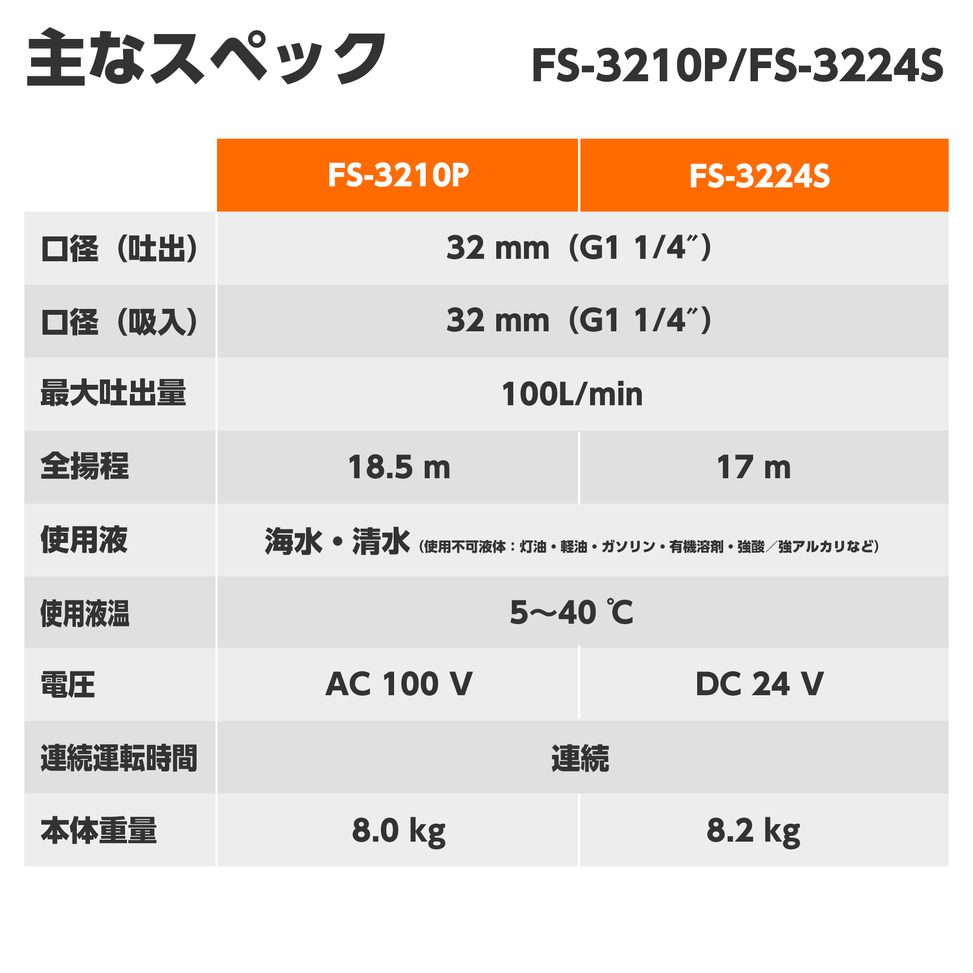 | 備考 | "※1:このポンプは【清水、海水専用】です。それ以外の液体を使用した場合には保証対象外となります。 ・清水とは、水道水、濁りのない井戸水・農業用水を示します。ただし、清水でも飲料水や食品用には使用できません。 ・海水とは塩分を含んだ水を示します。" |