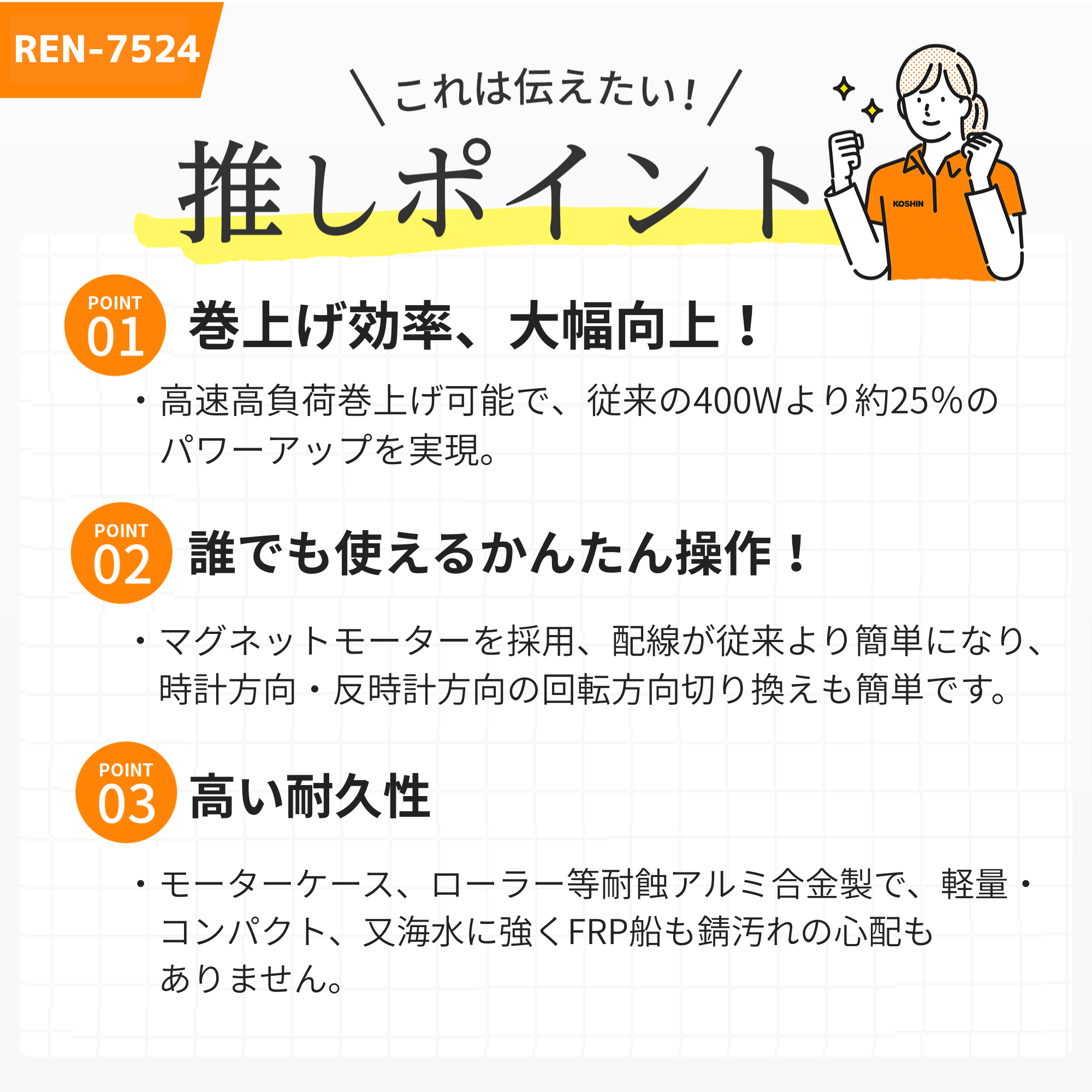 ●高速高負荷巻上げ可能で、従来の400Wより約25%のパワーアップを実現。