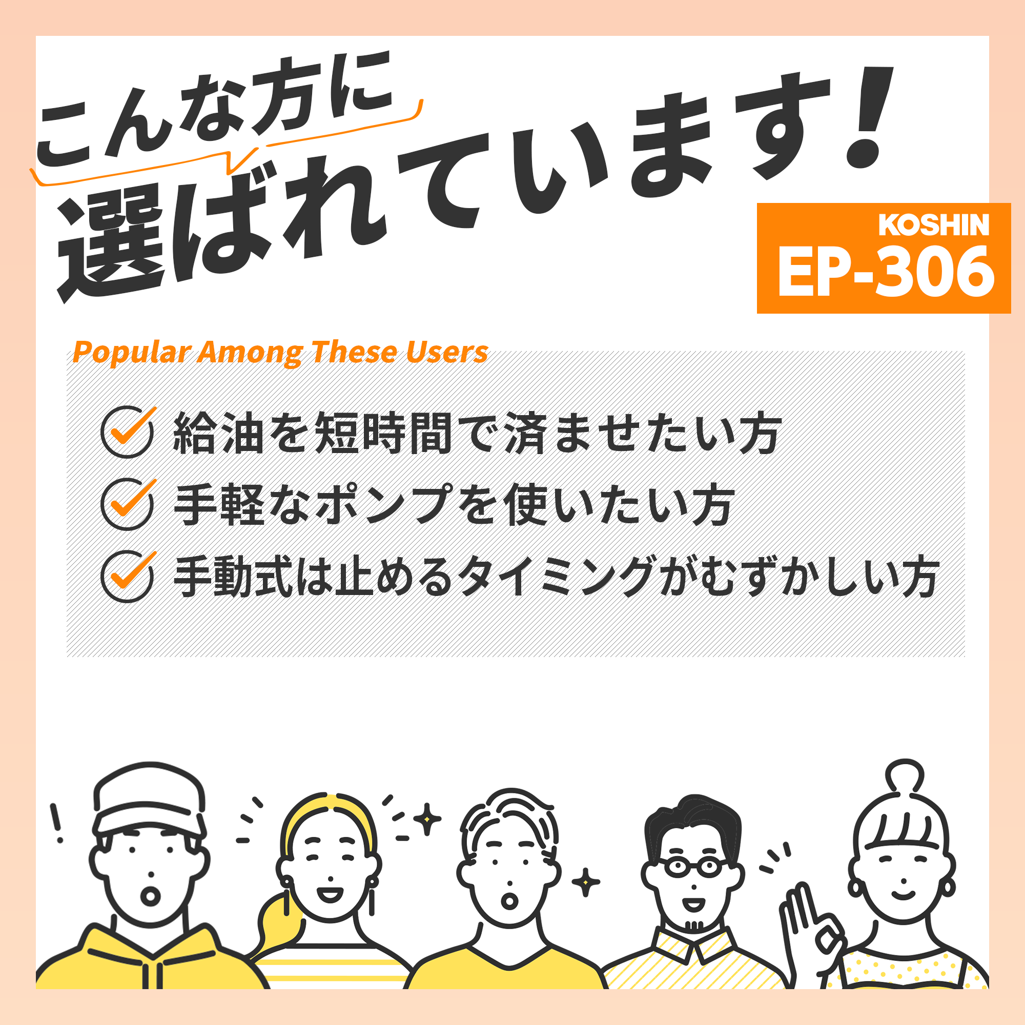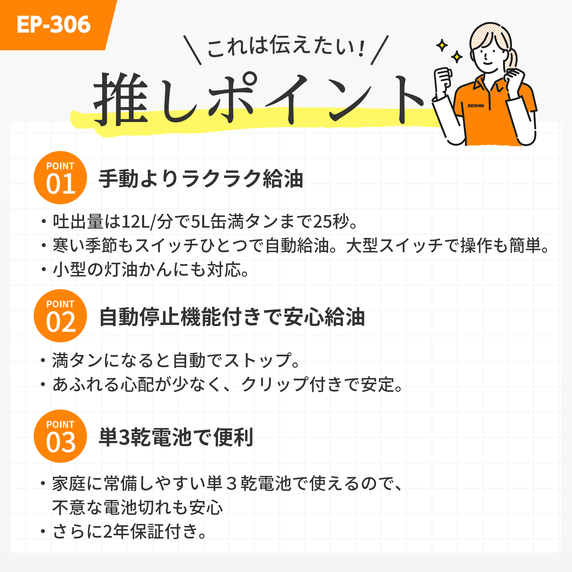 | 備考 | ※1:サイズが合わない器具には使わないでください (JIS規格推奨・認定マーク付き灯油かん推奨)。 ※2:JIS S 2037 流量試験法による。 ※3:用途以外の目的に使用しないでください。 使用不可液体例:軽油、ガソリン、第一石油類、A重油、溶剤、薬品、水など ※4:新旧・異種の電池を混用しないでください。 充電式電池も使用可能 (マンガン電池は使用不可)。 |