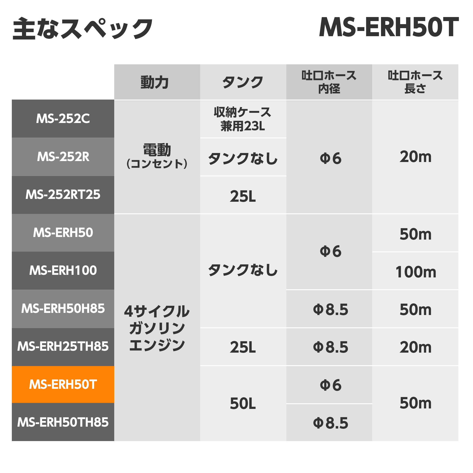 | 付属品 | 泡状除草二頭口噴口 1個、縦型二頭口噴口 1個、二段伸縮ノズルパイプクミ 1本、握りグリップ 1個、ヨリ戻し 1個、吐出ホース (φ6 x 50 m) 1本、吸入ホース (0.9 m) 1本、余水ホース (0.8 m) 1本、リールハンドル 1個、リールハンドル用ボルト 2本、ストレーナー 1個、ジュビリバンド 1個、オイル交換用ボトル 1個、取扱説明書 (ポンプ) 1部、取扱説明書 (エンジン) 1部 |