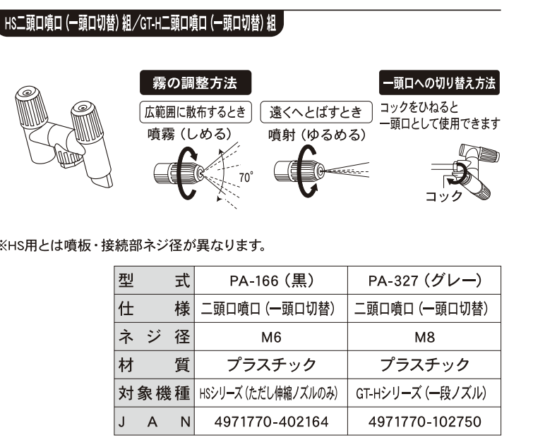 | 型式 | HS 伸縮2頭口噴口W切替パーツ(PA-166) |