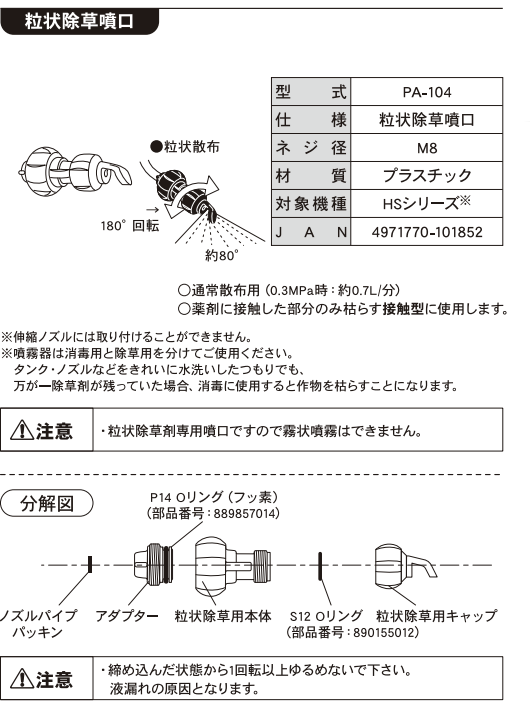 | 型式 | HS粒除草噴口クミパーツ (PA-104) |