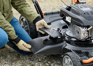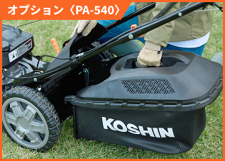 芝刈り用グラスバッグを後方排出ポートに装着すると回収がラクに。片付けの手間を減らし、仕上がりもキレイ。