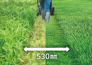 刈込幅はワイドな530mm。一度に刈れる範囲が広く、往復回数を減らして作業の負担を軽減。作業時間も短縮できる。