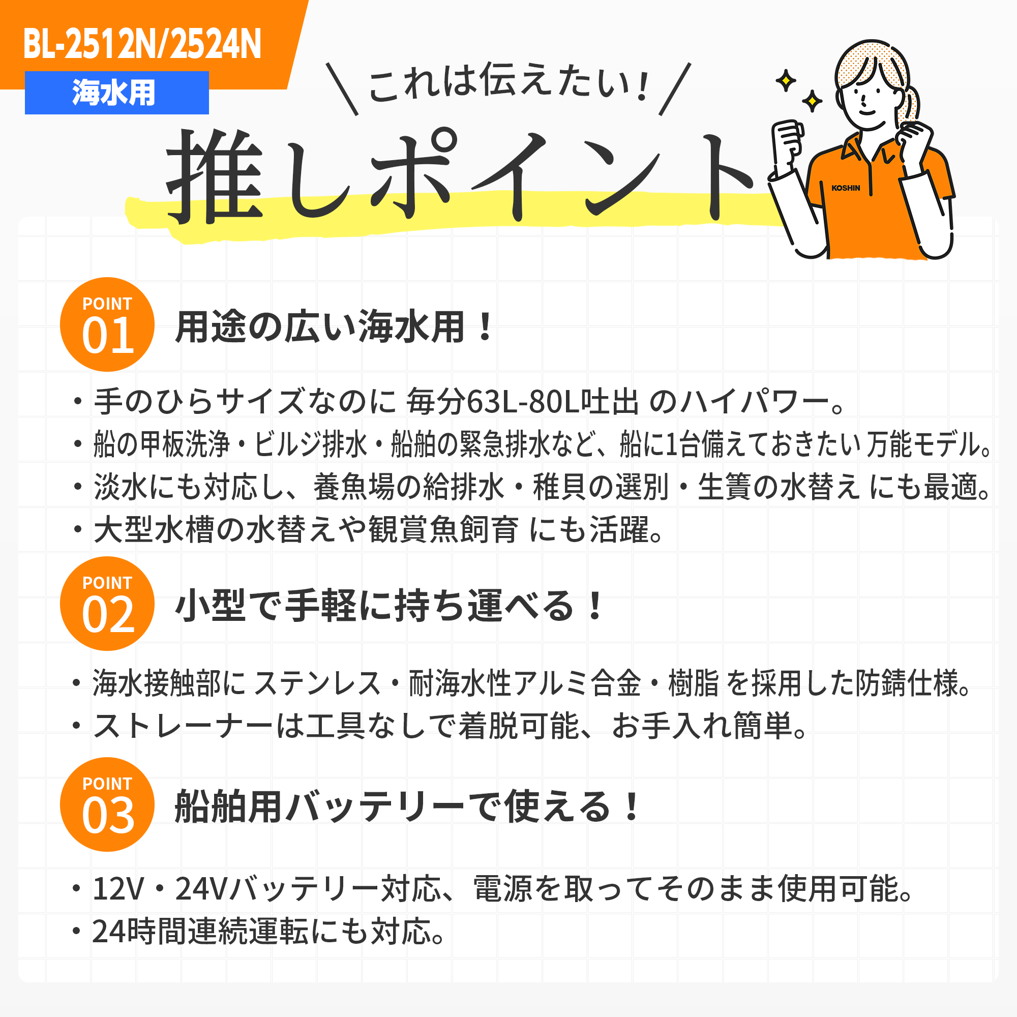 ●小型で手軽に持ち運び出来るので、ビルジ排水はもちろん、水中ポンプとしてあらゆる用途に使用できます。