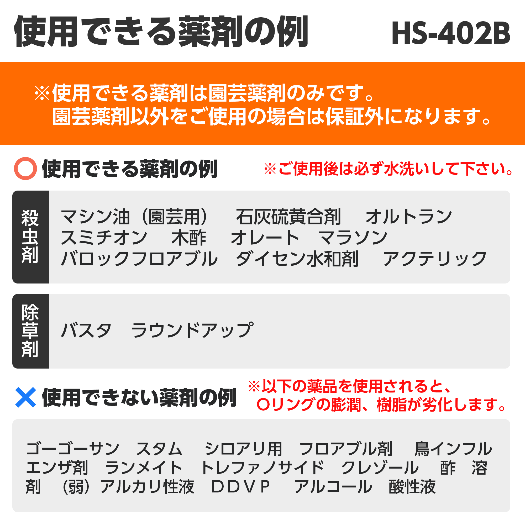 備考 | ※1:薬剤の種類や使用状況によって異なります。 ※2:薬害を防ぐため、噴霧器本体は消毒と除草の兼用使用はしないでください。 ※3:本体のみ。 |