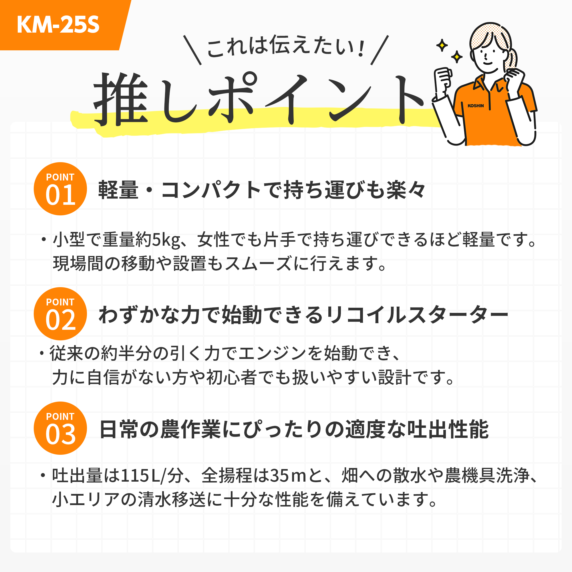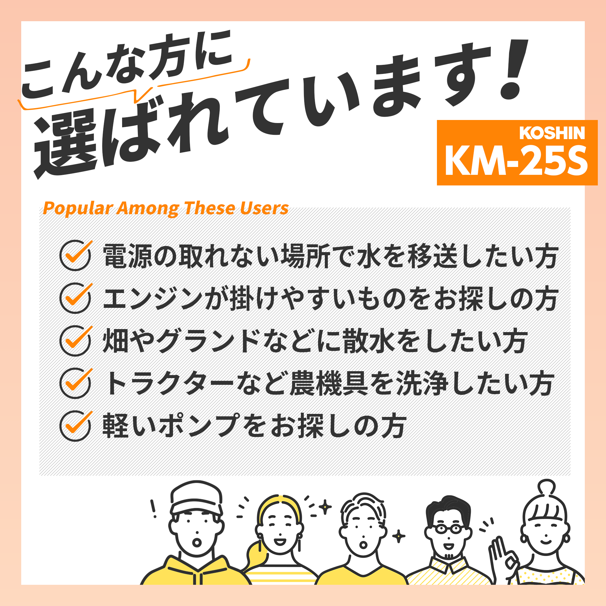 付属品 | ストレーナー 1個、吸入ホース (3m) 1本、ホースバンド (32 mm) 3個、ホースバンド (26 mm mm) 1個、ホースバンド (22 mm) 1個、カップリングクミ (25x25mm) 1個、ワンタッチカップリング 1個、タケノコニップル (25x20mm) 1個、タケノコニップル (25x15mm) 1個、エンジン工具 一式、取扱説明書 1部 |