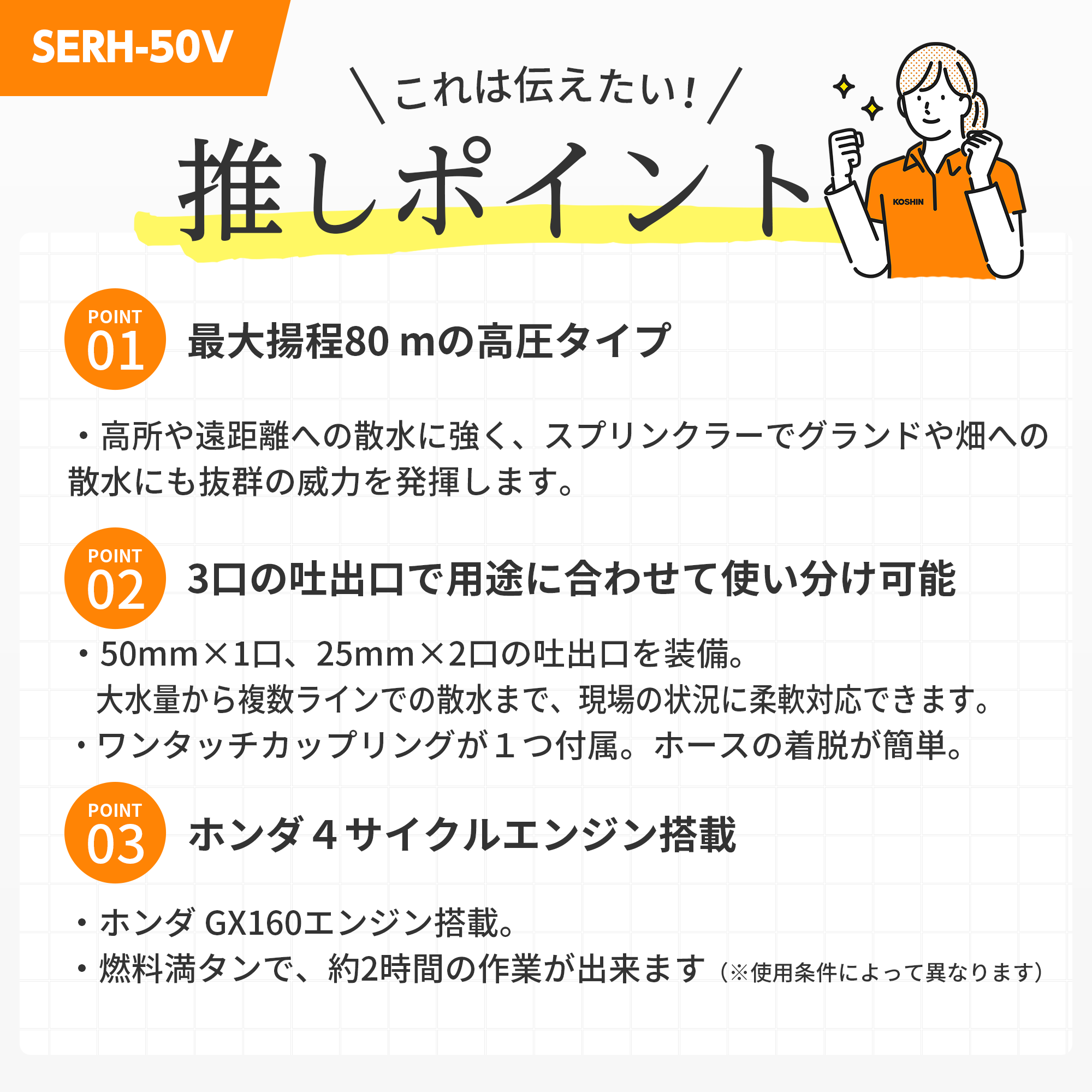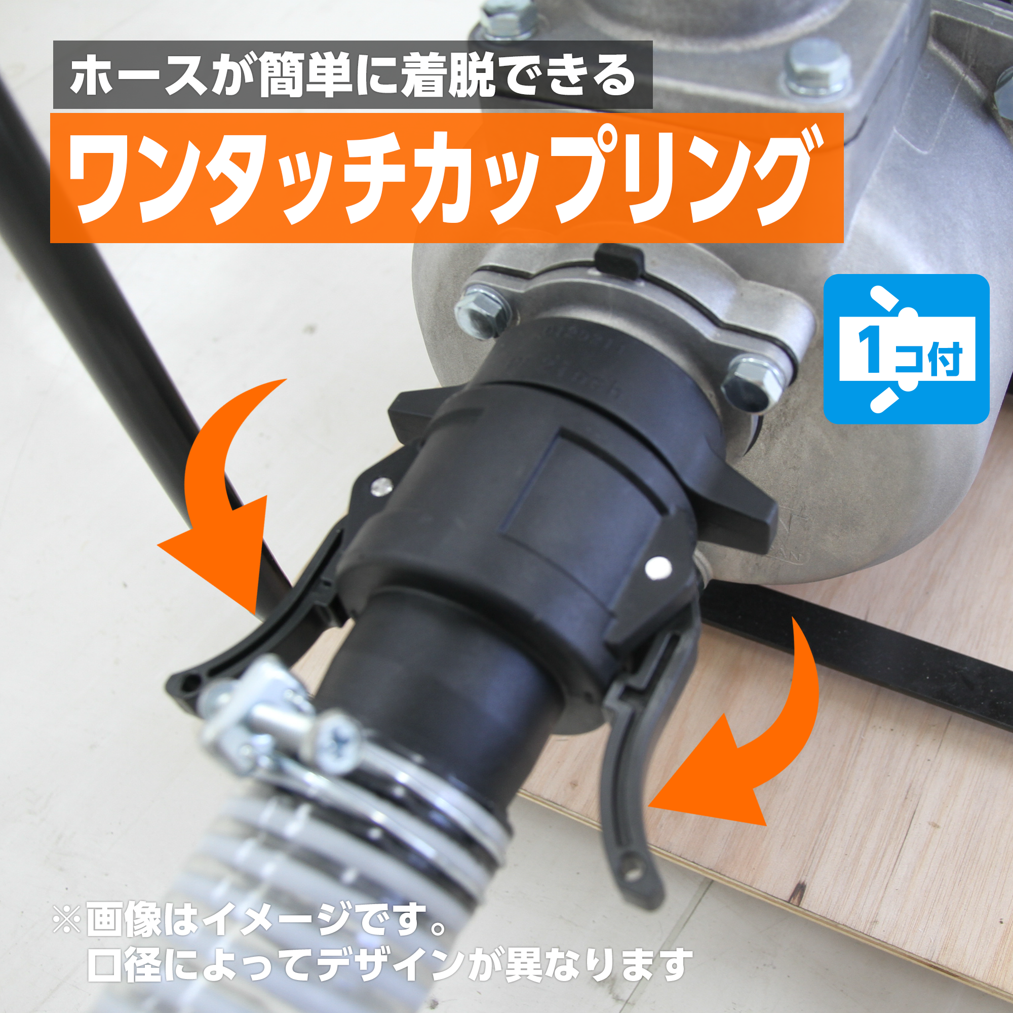 付属品 | カップリングクミ (50 mm) 1個、タケノコニップル (25x25 mm) 2個、ホースバンド (50 mm) 3個、ホースバンド (25 mm) 2個、ワンタッチカップリングクミ 1個、止水ワンタッチカップリングクミ(25mm用) 2個、止水板 (50mm用) 1個、ストレーナー 1個、エンジン工具 一式、取扱説明書 1部 |