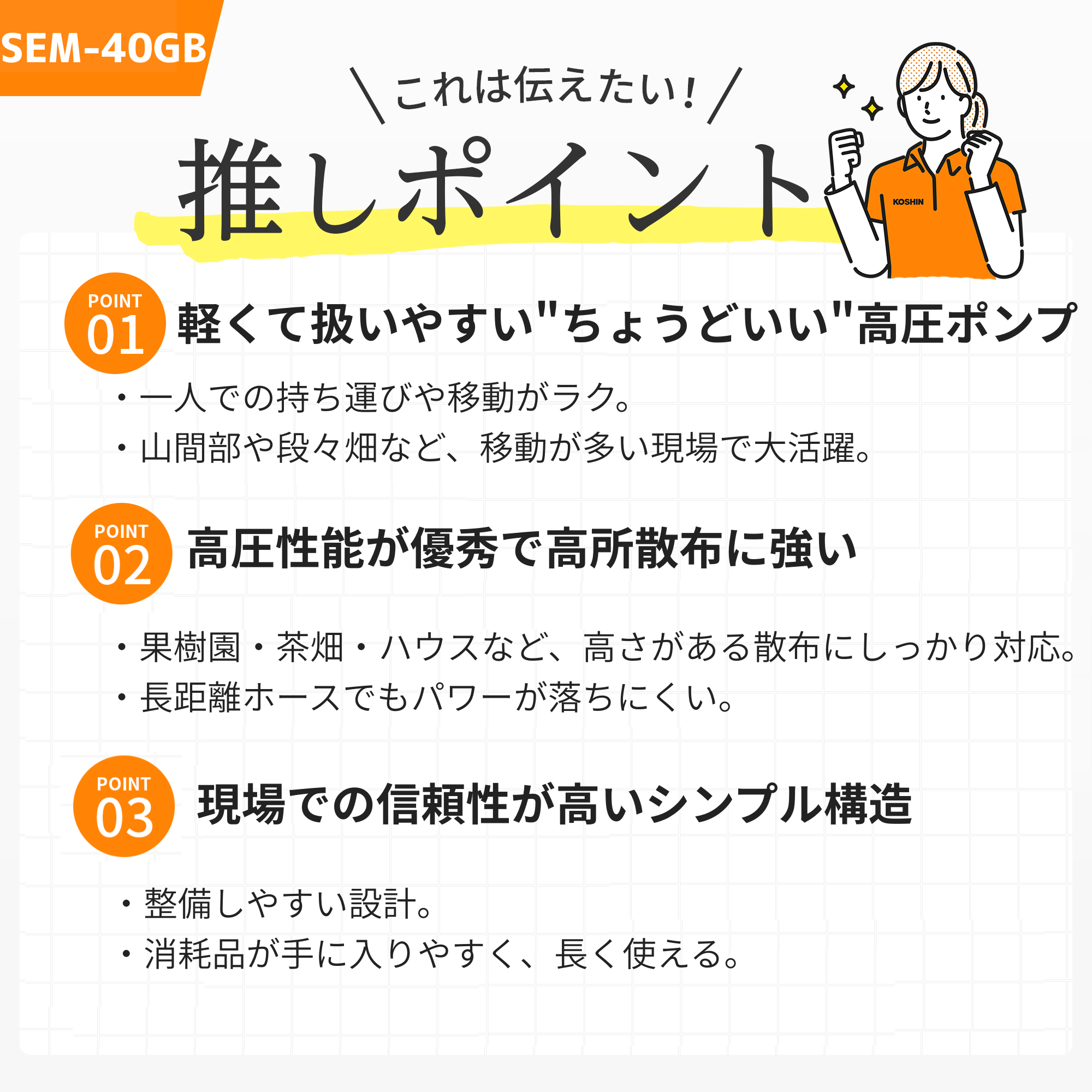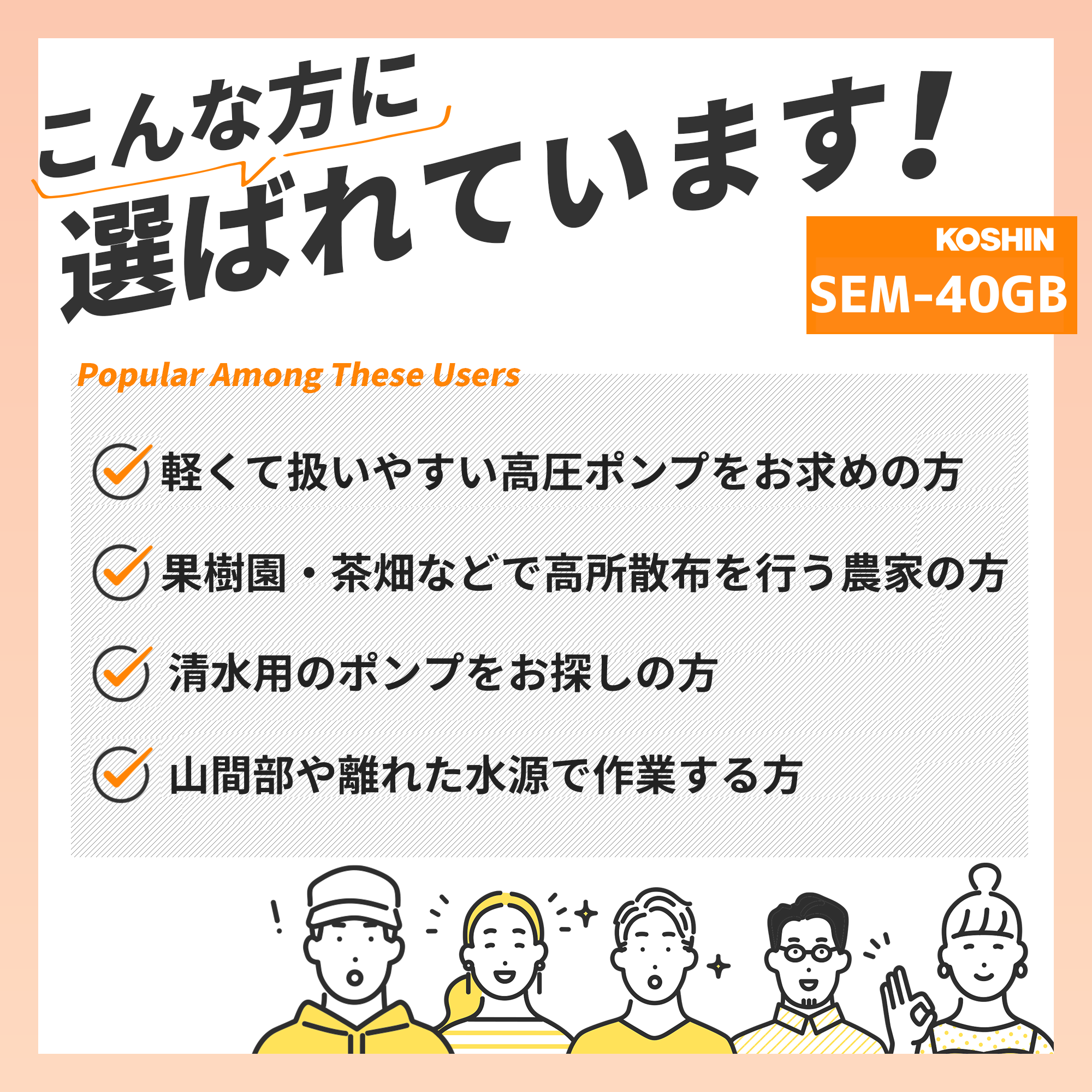 | 備考 | ※1:使用条件によって異なります。 ※2:このポンプは【清水専用】です。それ以外の液体を使用した場合には保証対象外となります。 ・清水とは、水道水、濁りのない井戸水・農業用水を示します。ただし、清水でも飲料水や食品用には使用できません。 |