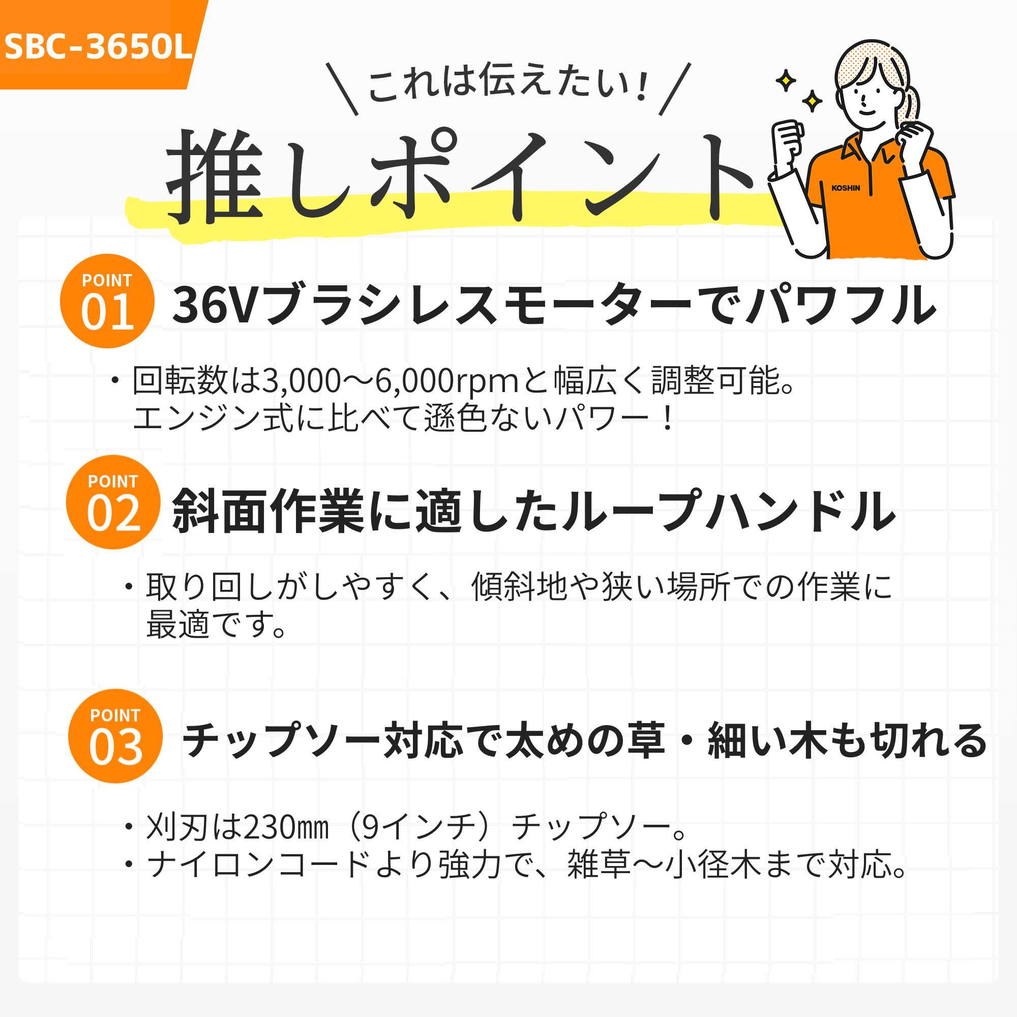 | 付属品 | チップソー 1個、刈刃カバー 1個、飛散防護カバー 1個、ループハンドル 1個、ループハンドル固定用ボルト (M5x20) 4本、ループハンドル固定用ナット (M5) 4個、ループハンドル固定板 1個、肩掛けバンド 1本、飛散防護カバー取付け用六角穴付ボルト (M5x16) 2本、取付け金具 1個、保護メガネ 1個、六角レンチ 1個、ボックスレンチ 1個、36Vバッテリー (5.0 Ah) 1個、36V急速充電器 1個、取扱説明書 1部 |