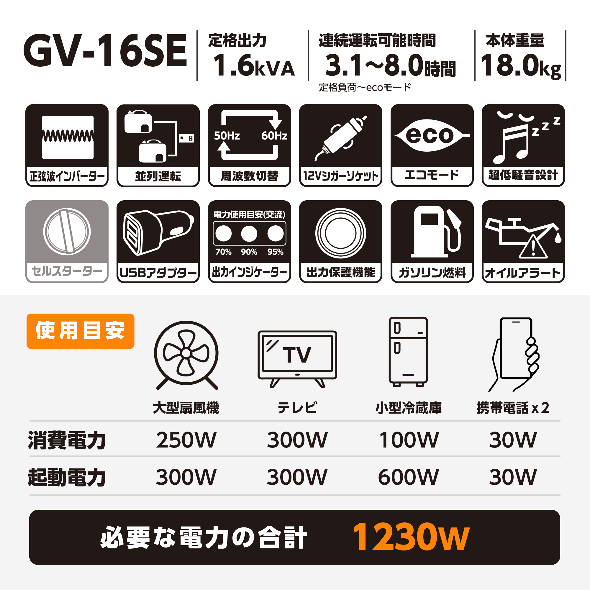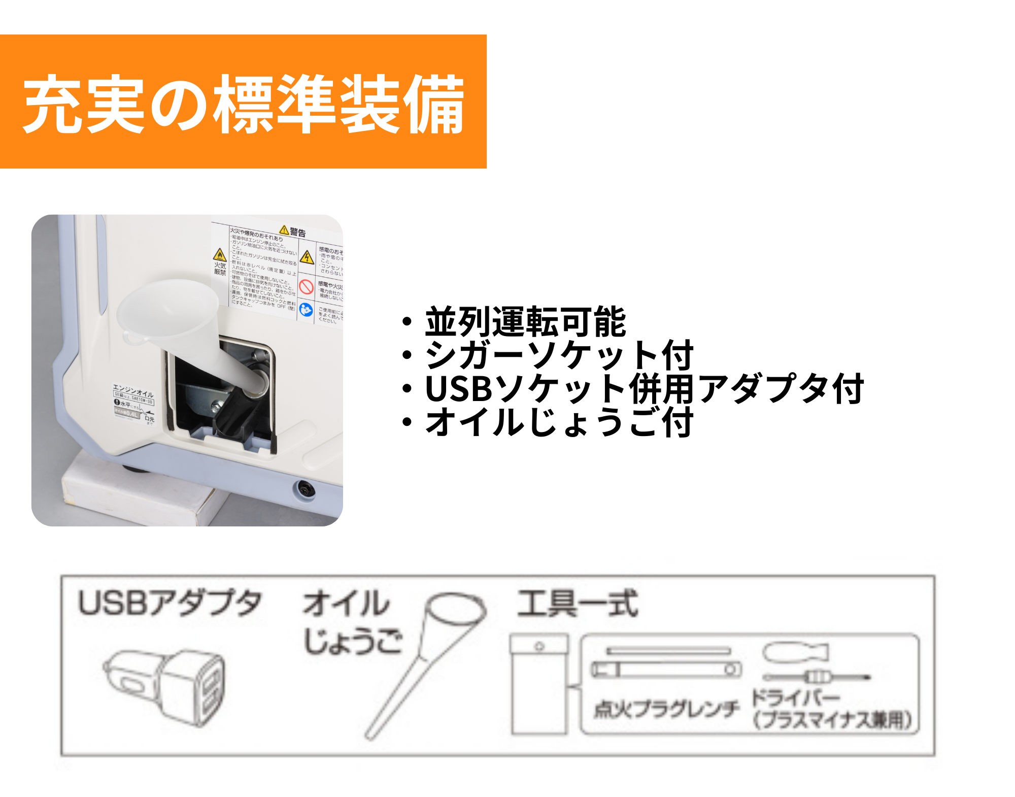 付属品 | バーハンドル 1本、点火プラグレンチ (六角対辺:16 mm) 1個、ドライバー (プラスマイナス兼用) 1本、オイルじょうご1個、USBアダプター 1個、取扱説明書 1部 |