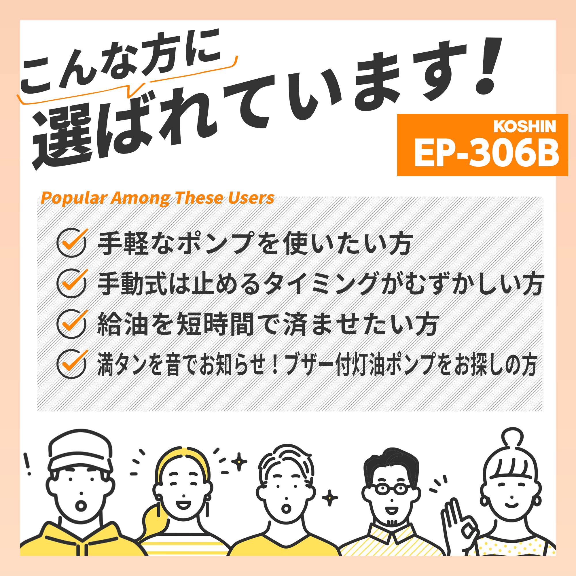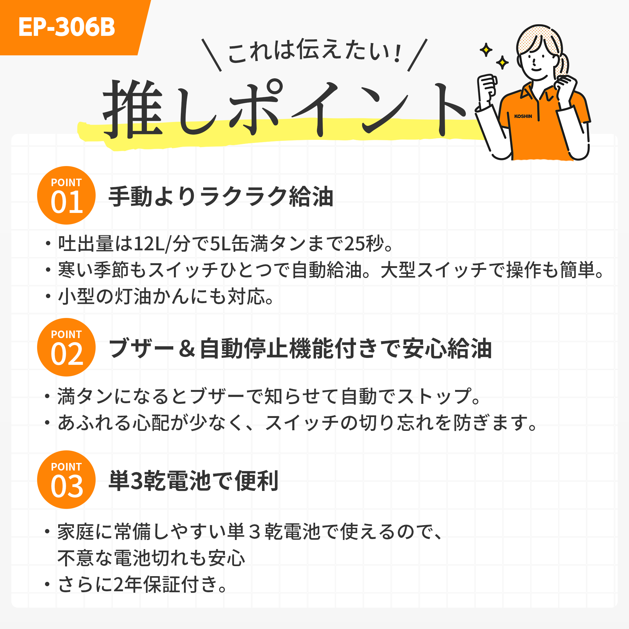 備考 | ※1:サイズが合わない器具には使わないでください (JIS規格推奨・認定マーク付き灯油かん推奨)。 ※2:JIS S 2037 流量試験法による。 ※3:用途以外の目的に使用しないでください。 使用不可液体例:軽油、ガソリン、第一石油類、A重油、溶剤、薬品、水など ※4:新旧・異種の電池を混用しないでください。 充電式電池も使用可能 (マンガン電池は使用不可)。 |
