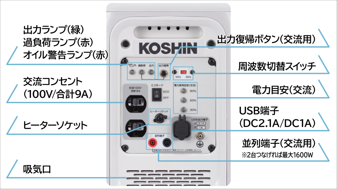 備考 | 発電機を下記環境に使用されると、出力が低下する場合があります。この場合は発電機の負荷を下げてください。 周囲温度:40 °C以上、気圧:100 kPa以下、相対湿度:30 % 以上 使用カセットボンベ (別売):JIA認証表示のある市販のカセットボンベ x 2本 安全装置:圧力安全弁 始動方式:リコイルスターター方式 騒音値:7m 1/4負荷~定格負荷の測定値 |