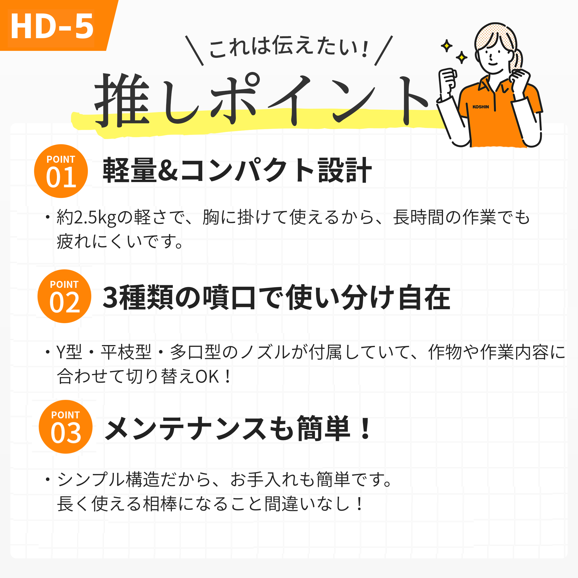 ●3種類の噴口付で散布場所に合わせて選定できます