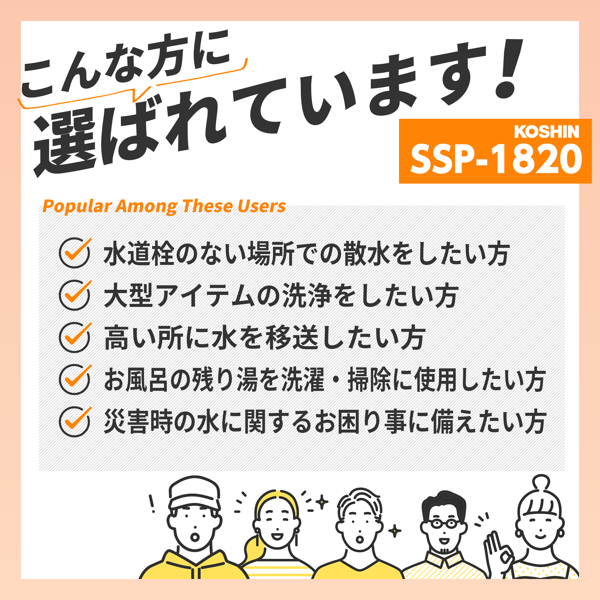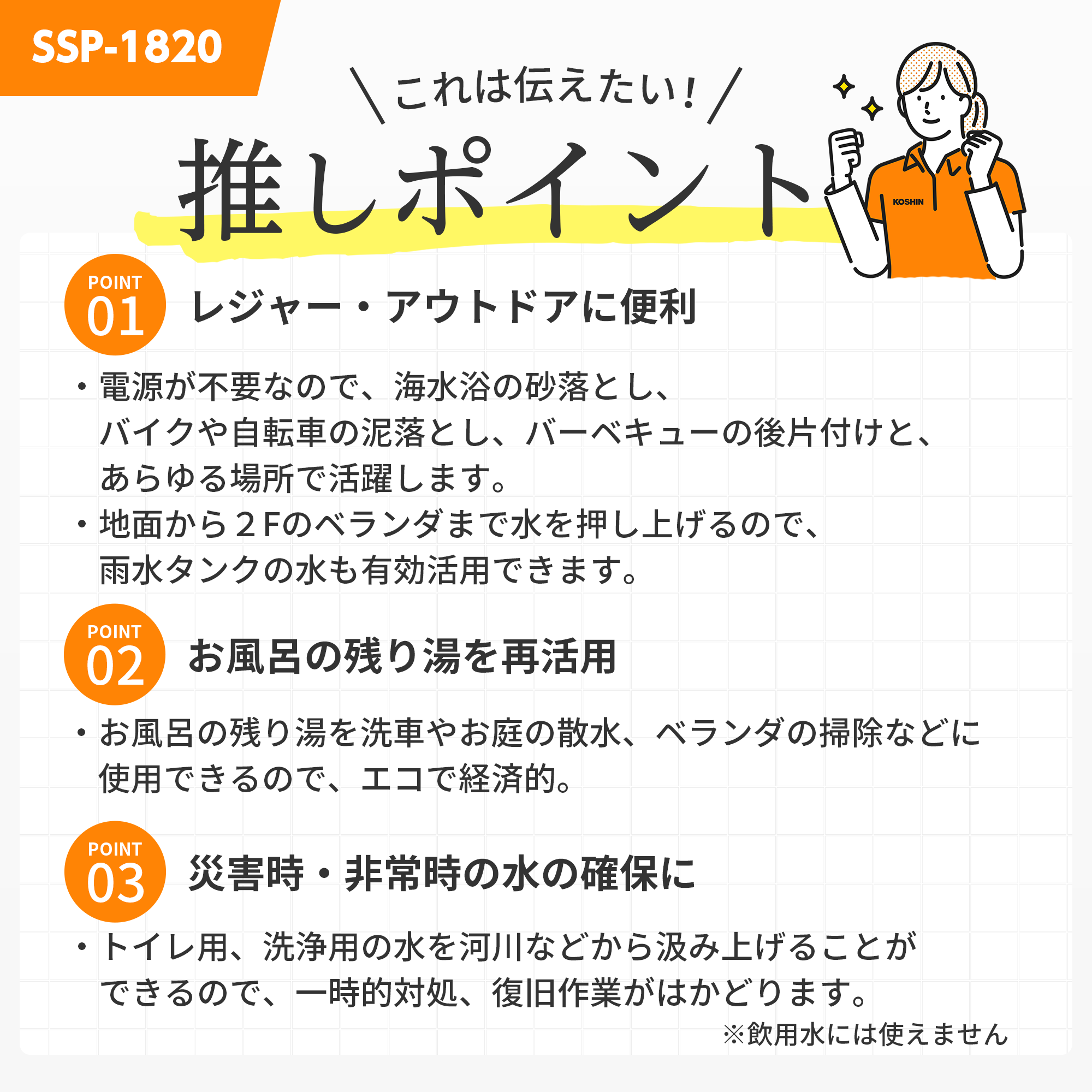 備考 | ※1:1充電あたり。最大揚程時の運転時間です。気温や使用状況によって異なります。※2:このポンプは【清水専用】です。それ以外の液体を使用した場合には保証対象外となります。・清水とは、水道水、濁りのない井戸水・農業用水を示します。ただし、清水でも飲料水や食品用には使用できません。・使用不可液体例:海水、汚水、農薬、消毒液、灯油、有機溶剤など※3:充電器は含みません。※4:昇圧器などのトランス類を使用したり、直流電源やエンジン発電機では使用しないでください。発熱・火災のおそれがあります。 |