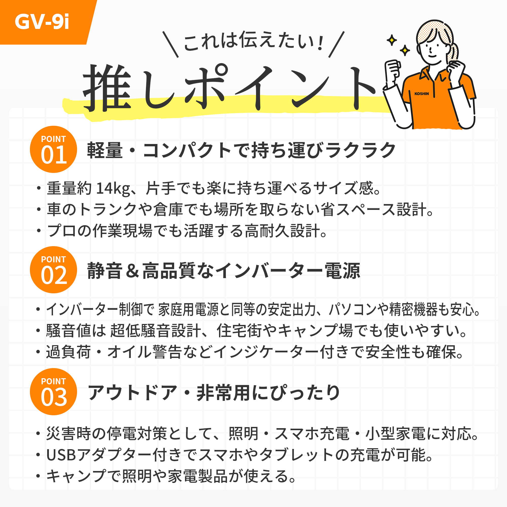 付属品 | バーハンドル 1本、点火プラグレンチ (六角対辺:16 mm) 1個、USBアダプター 1個、ドライバー (プラスマイナス兼用) 1本、取扱説明書 1部 |