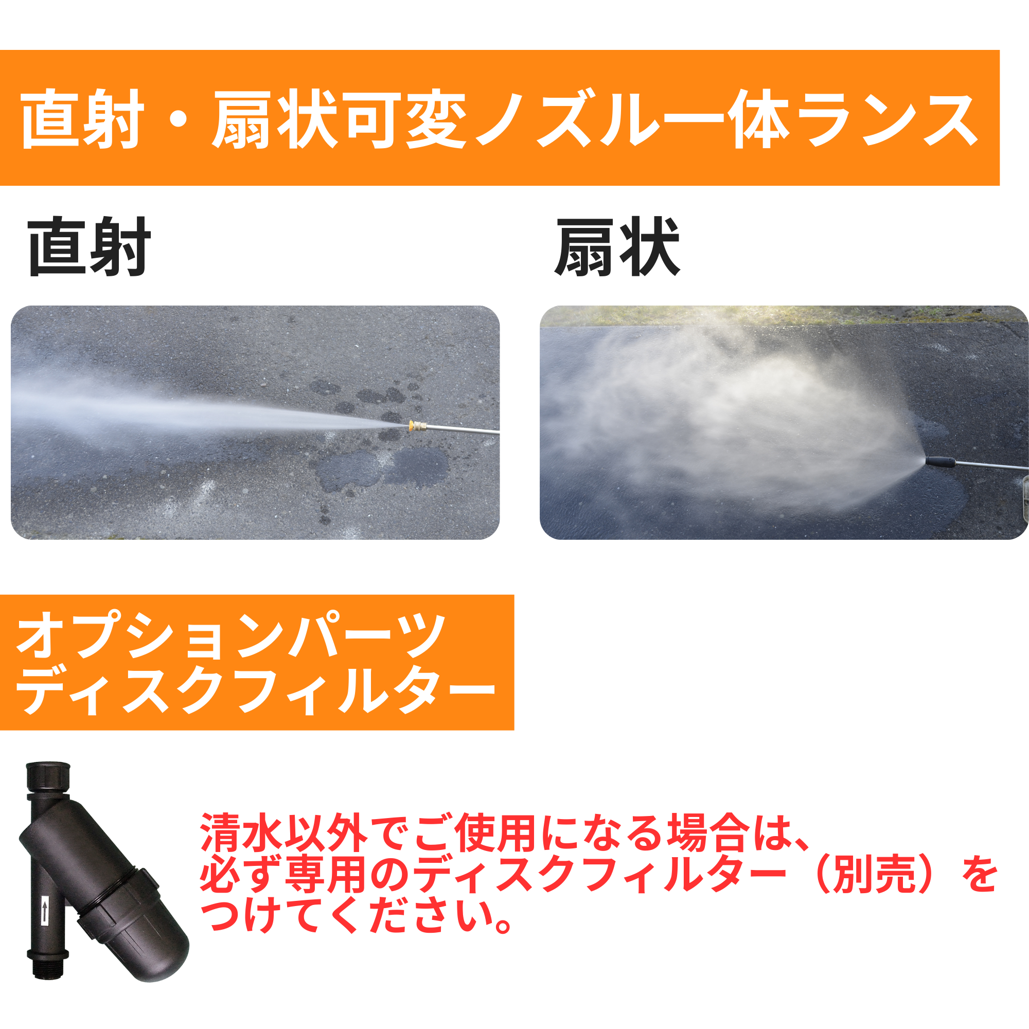 付属品 | ガン ネジ式 1個、吐出ホース (10 m) ネジ式 1本、直射/扇状可変ノズル一体ランス 1本、吸入ホース (3 m) 1本、ストレーナー 1個、水道直結用ホース 1本、水道直結用ホースバンド 1個、洗剤吸引ホース 1本、ノズルクリーナーピン 1個、余水ホース (3 m) 1本、取扱説明書 1部 |