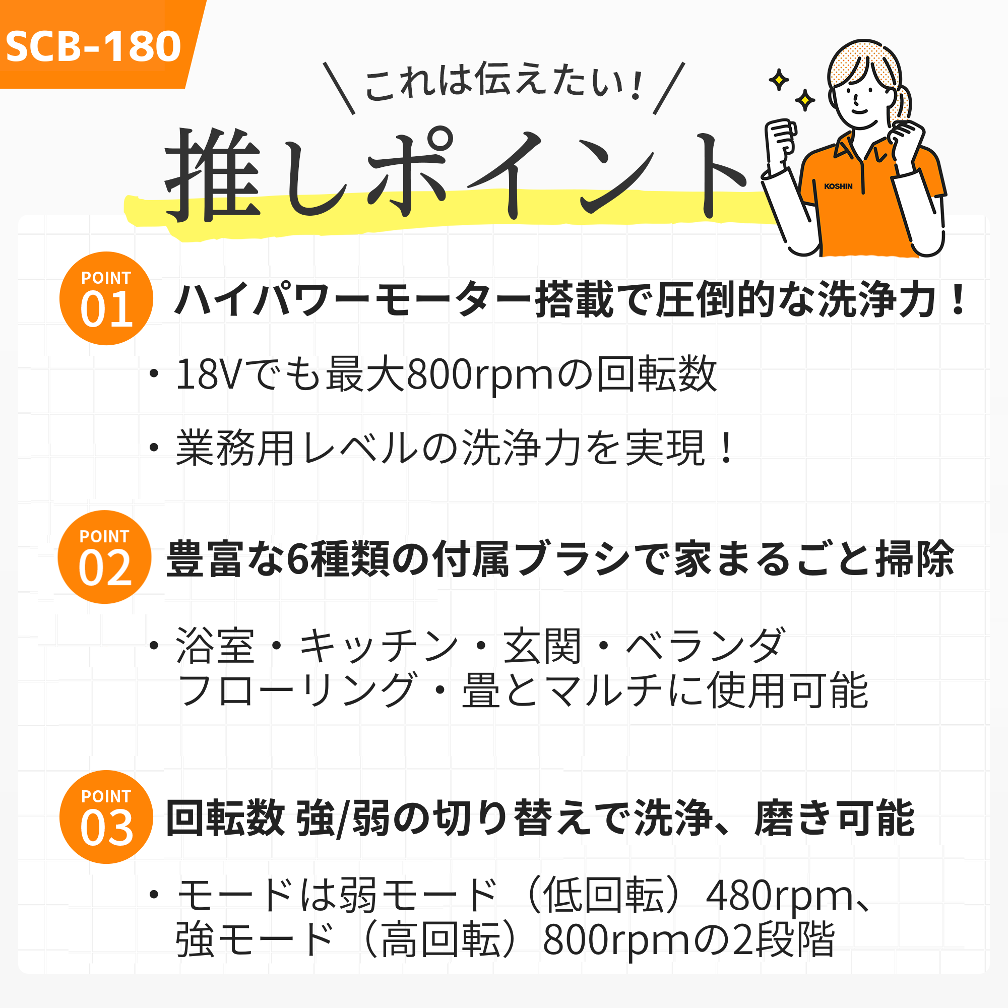 1.圧倒的な洗浄力:充電式なのに最大800rpmの回転数でパワフルに洗浄!
