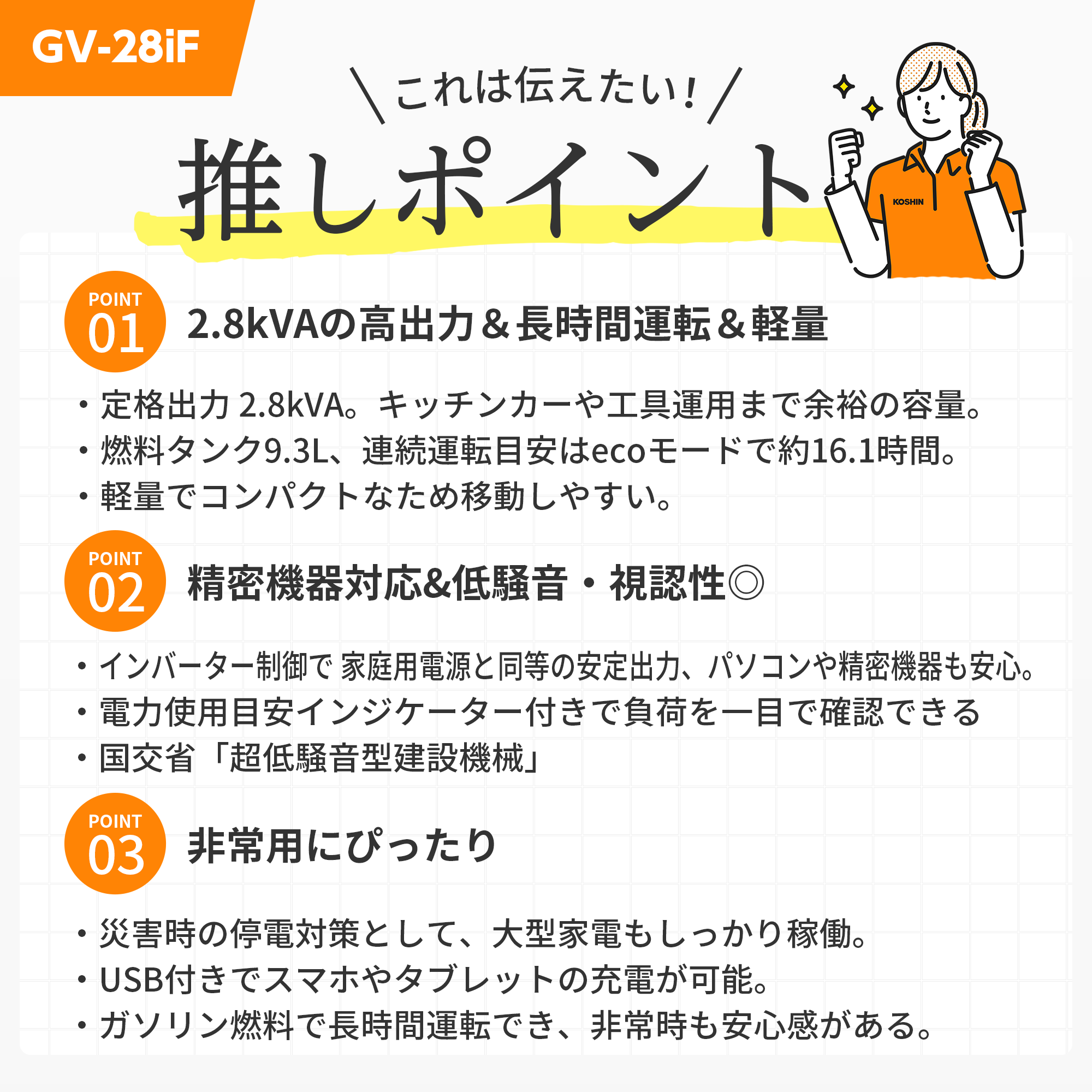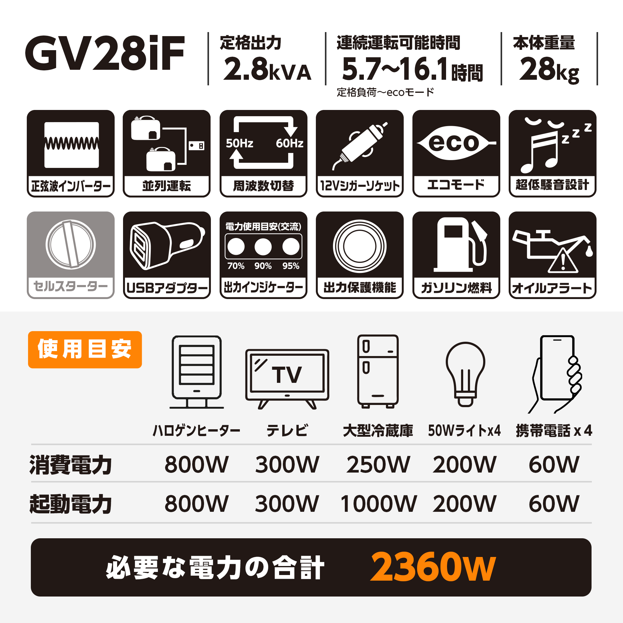 備考 | 発電機を下記環境に使用されると、出力が低下する場合があります。 この場合は発電機の負荷を下げてください。 周囲温度:40 °C以上、気圧:100 kPa以下、相対湿度:30 % 以上 |