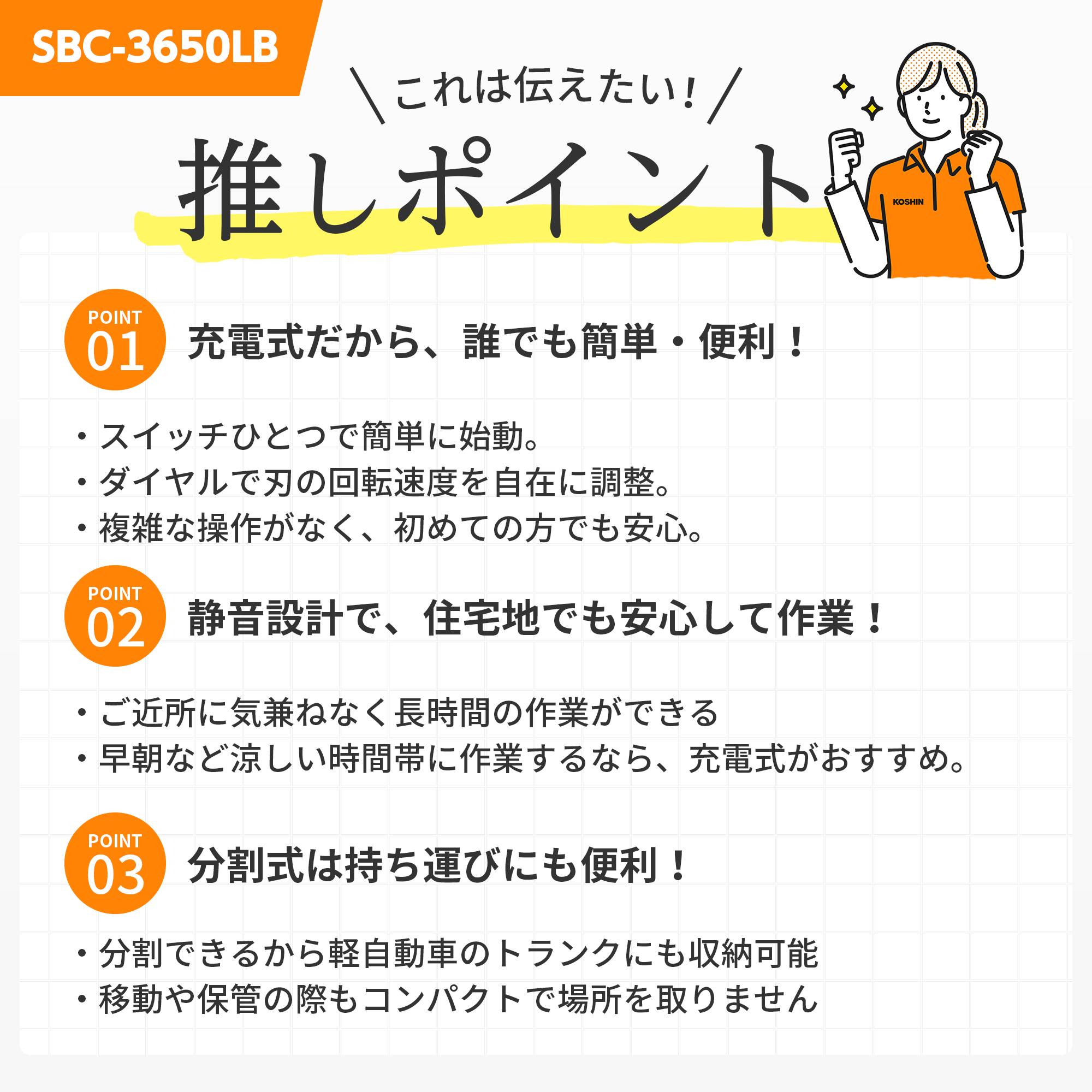 | 草刈機_連続運転時間 | 満充電のバッテリーを1回使い切る毎に、20分程度の休憩 |
