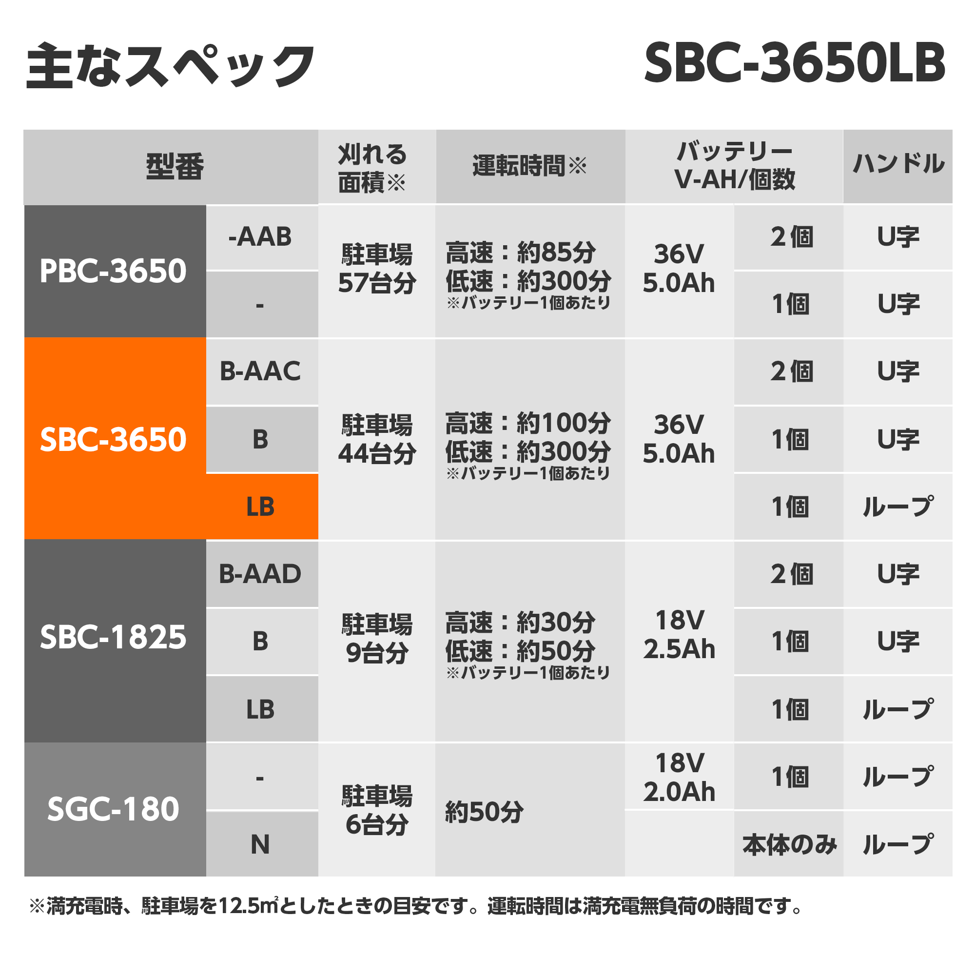| 付属品 | チップソー 1個、刈刃カバー 1個、飛散防護カバー 1個、ループハンドル 1個、ボルト(M5×20) 4本、ナット(M5) 4個、肩掛けバンド 1本、飛散防護カバー取付け用六角穴付ボルト (M5x20) 1本、保護メガネ 1個、六角レンチ 1個、結束バンド 1本、ボックスレンチ 1個、36Vバッテリー (5.0 Ah) 1個、バッテリーチャージャー36V 1個、取扱説明書 1部 |
