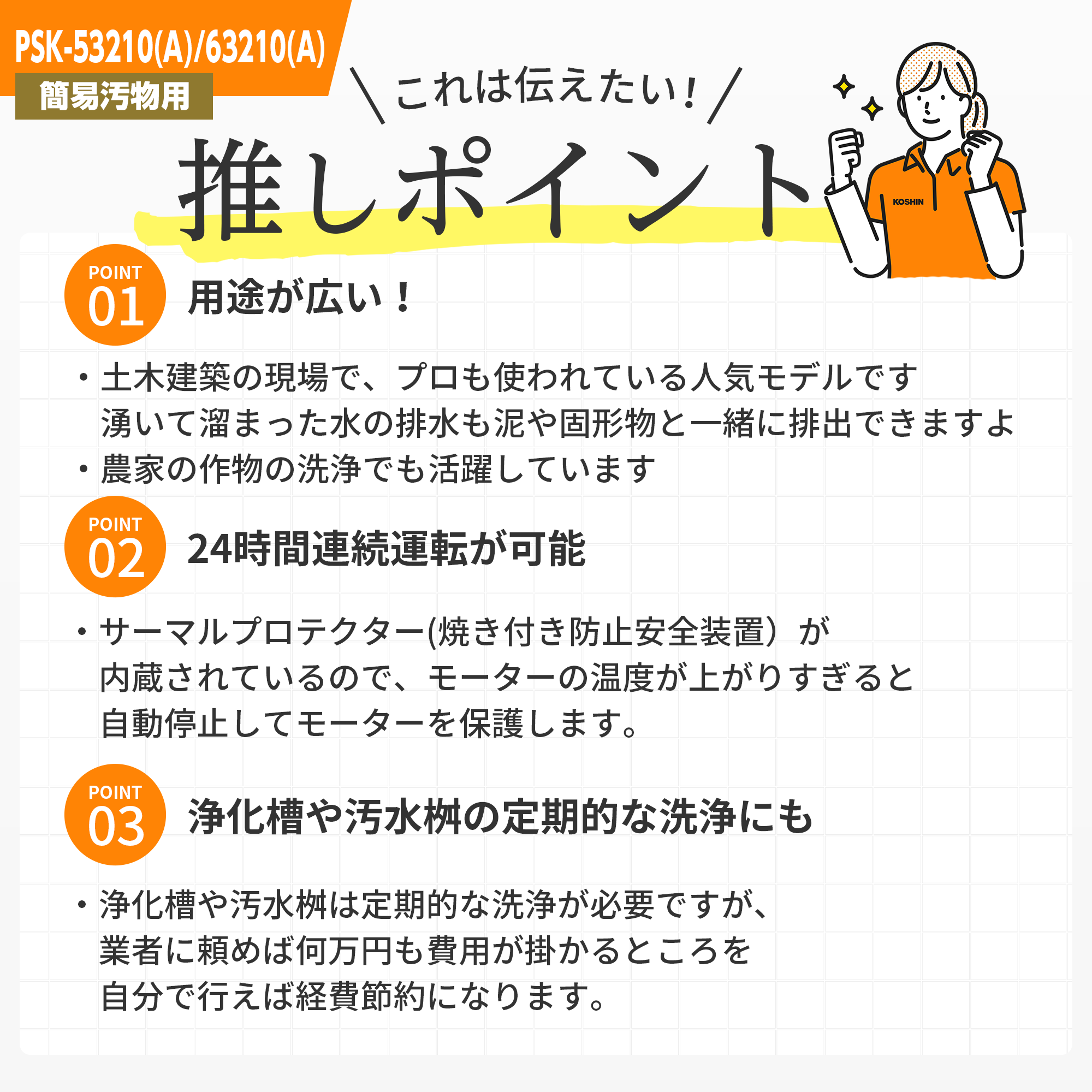 | 備考 | "※1:本機は5~40℃の【清水】・【簡易汚水】・【汚水】・【簡易汚物】専用です。 それ以外の水質、または塩水、油、溶剤、薬品、酸性やアルカリ性の液体などを使用した場合は保証対象外となります。 ・【清水】とは、水道水、農業用水、井戸水などのうち、濁りのない水を指します。 濁りの無い水でも飲料水や食品用には使えません。 ・【簡易汚水】とは、水道水、農業用水、井戸水などのうち、濁りのある水を指します。 細かい粒子の混じった水に使用すると、ポンプ寿命が著しく短くなります。 ・【簡易汚物】とは、10㎜以下の固形物(やわらかいもの)を含んだ、水分90%以上の水を指します。 吸い込み可能な固形物サイズは機種によって異なります。 土砂・スラリーの混じった水に使用すると、ポンプ寿命が著しく短くなります。" |