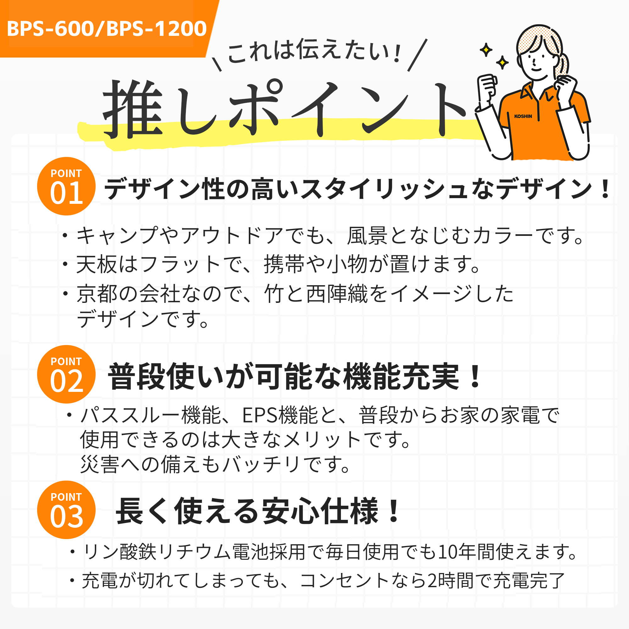 | DC出力_シガーソケット出力端子 | 1口、 12 V-10 A 出力120 W |