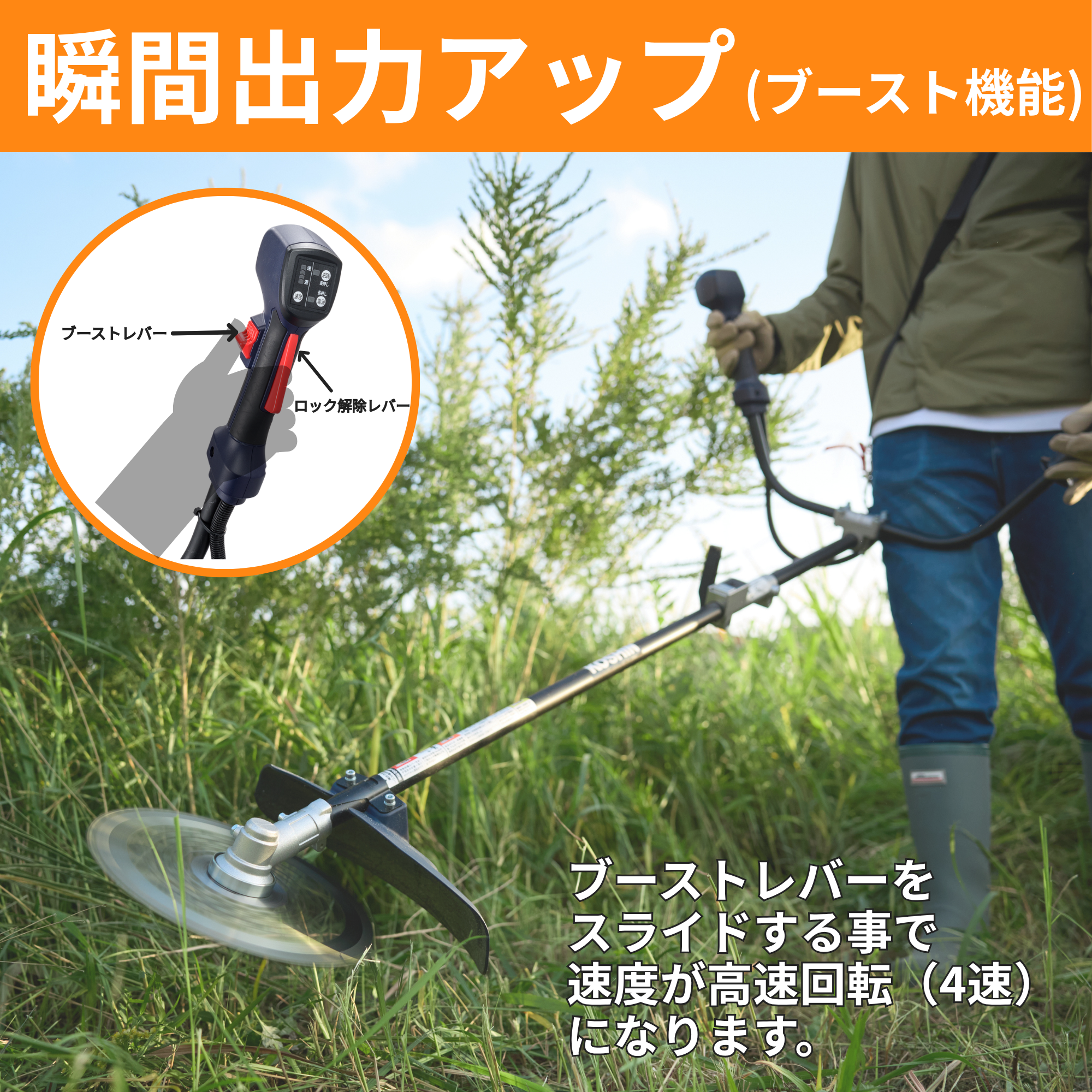 | 備考 | 特徴:リアモーター、ブースト機能、逆回転(絡み取り)機能、防塵防水機能(IPX4) ※1:1充電あたり。また、気温や切断対象などの状態により異なります。 ※2:バッテリー含む。刈刃、飛散防護カバー、肩掛けバンドは含まず。 ※3:気温やバッテリーの充電残量などにより異なります。特に長期保管後は長くなることがあります。 ※4:昇圧器などのトランス類を使用したり、直流電源やエンジン発電機では使用したりしないでください。 発熱・火災のおそれがあります。 |