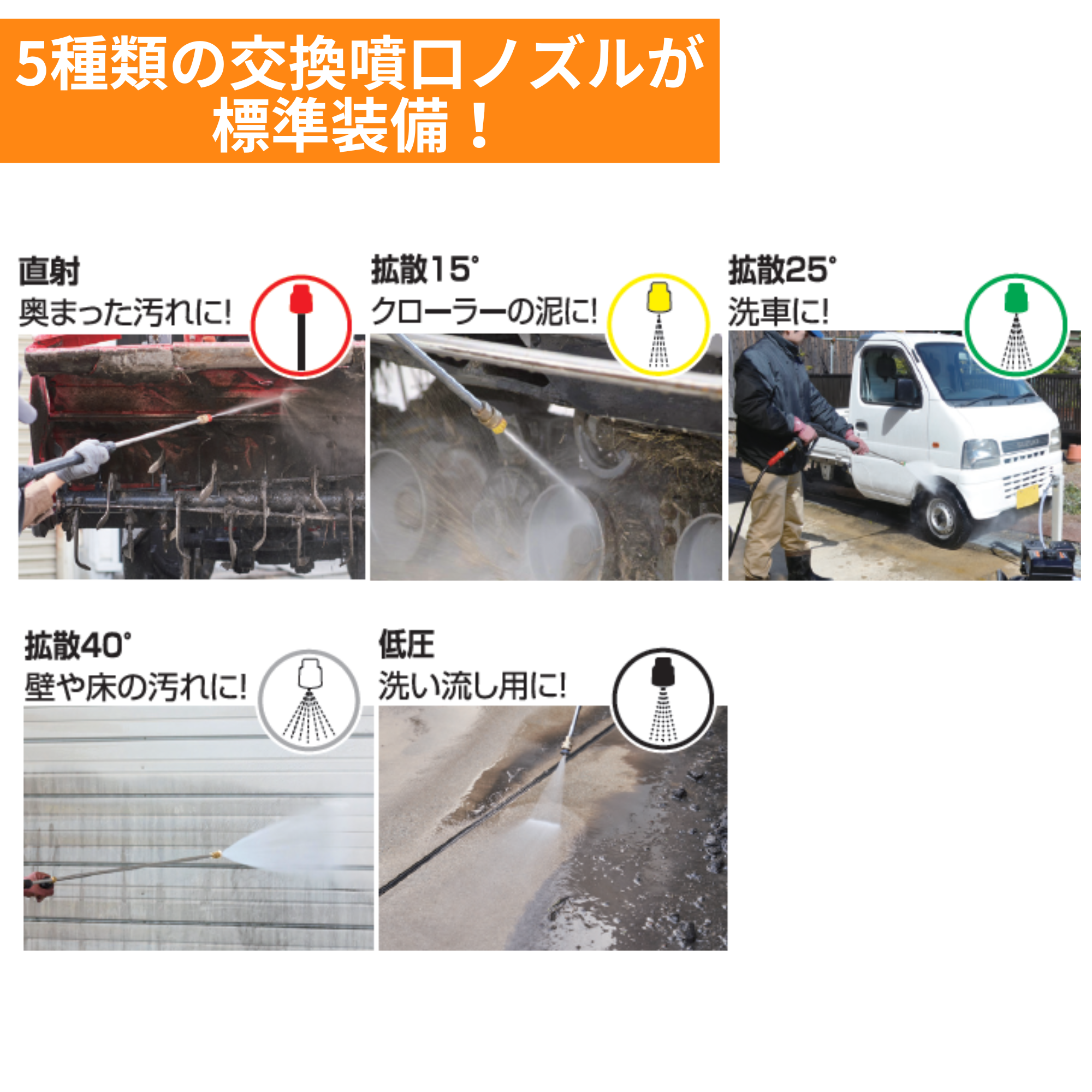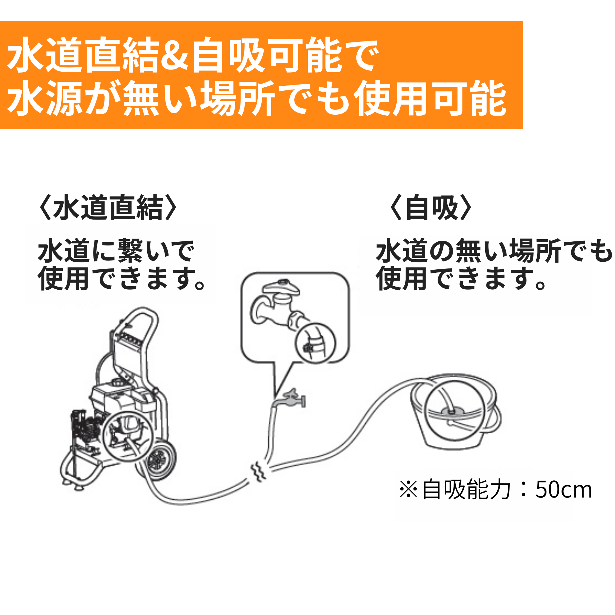 付属品 | ガン ネジ式 1個、 ノズル交換式ランス 1本、 吐出ホース (8 m) ネジ式 1本、 吸入ホース (3 m) 1本、 交換噴口ノズル 5種、 ストレーナー 1個、 ストレーナーカップリング 1個、 ホースバンド 1個、 ノズルクリーナーピン 1個、 点火プラグレンチ 1本 取扱説明書 1部 エンジン取扱説明書 1部 |
