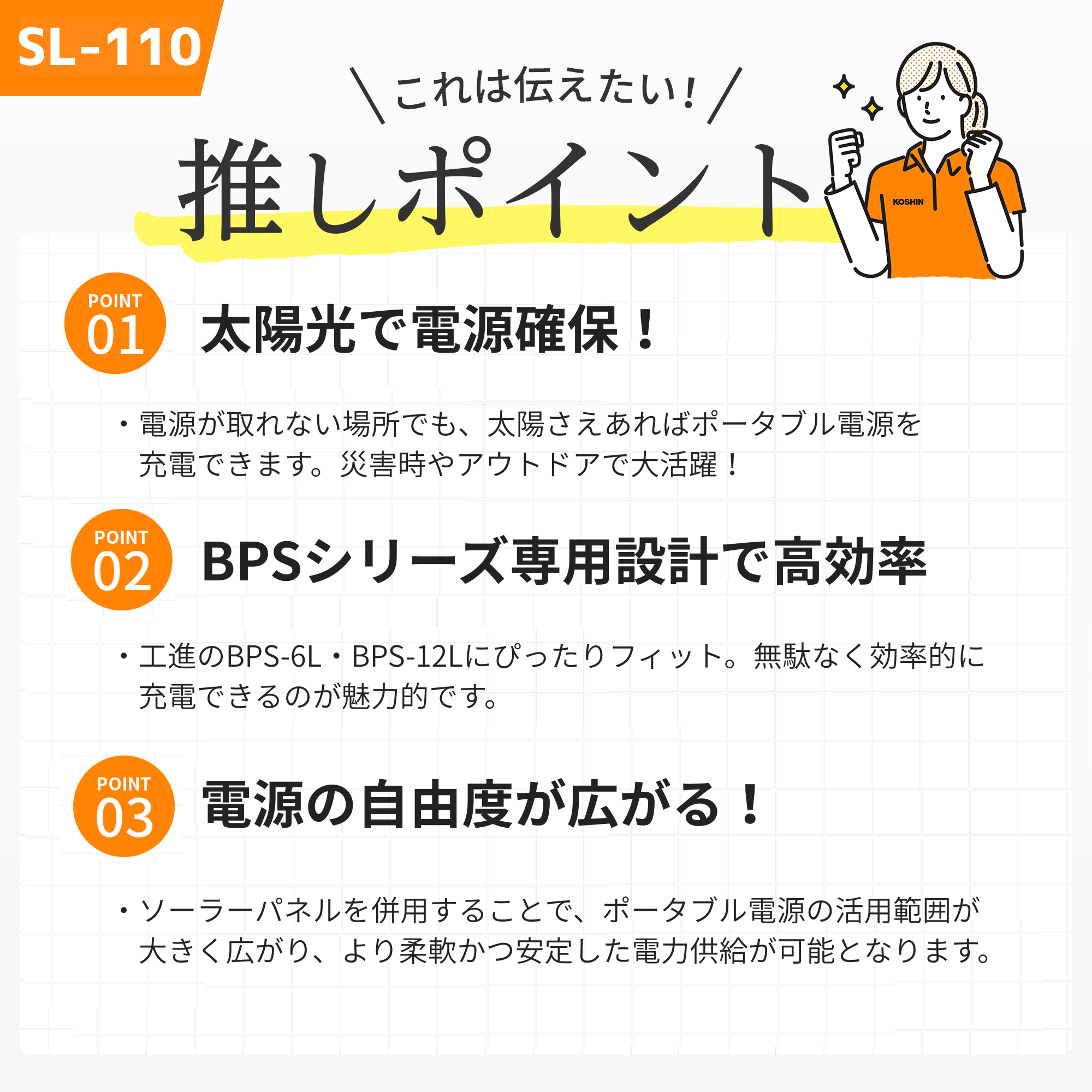 | 用途 ※1,2 | 工進製ポータブル電源 BPS-6L, BPS-12Lの充電 |