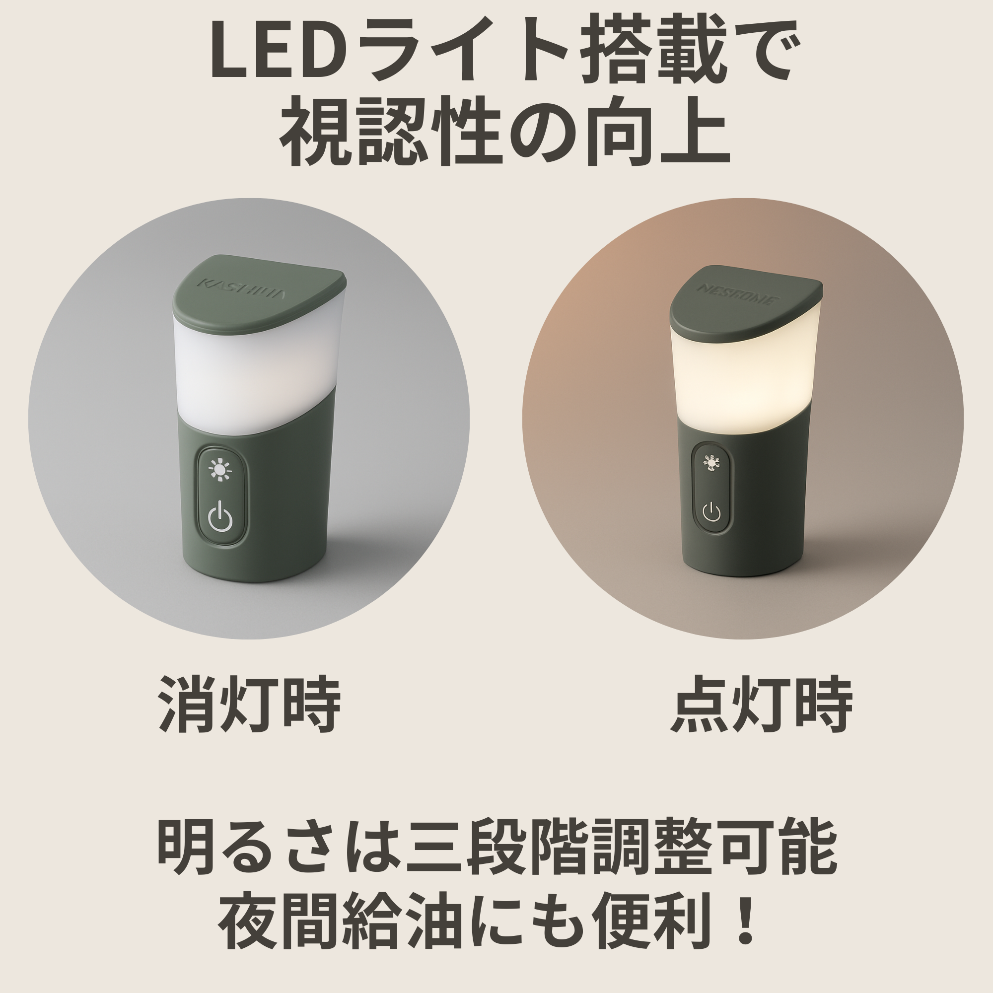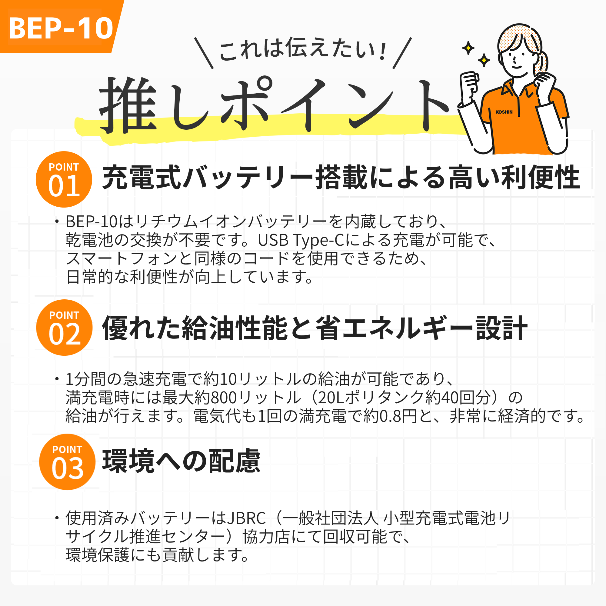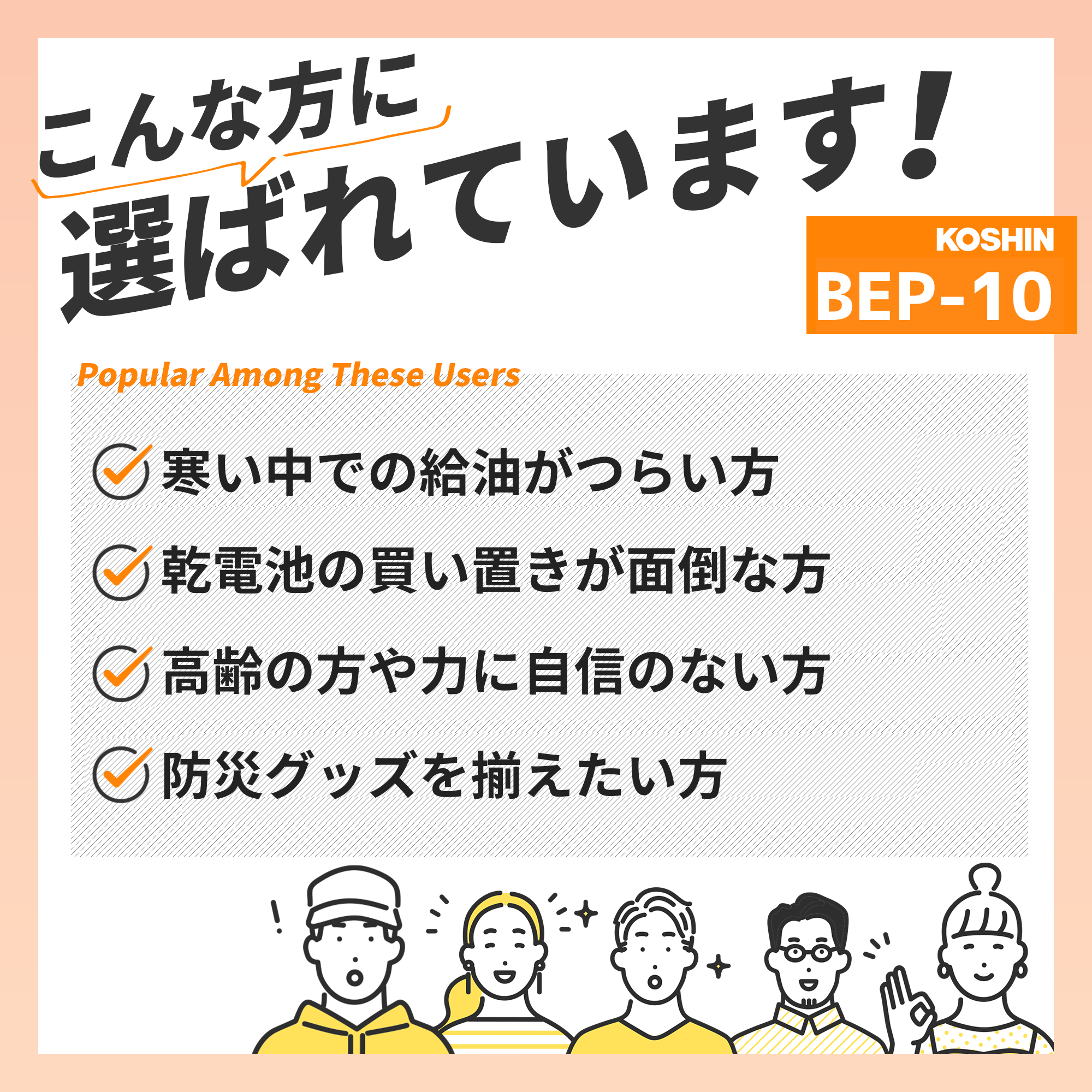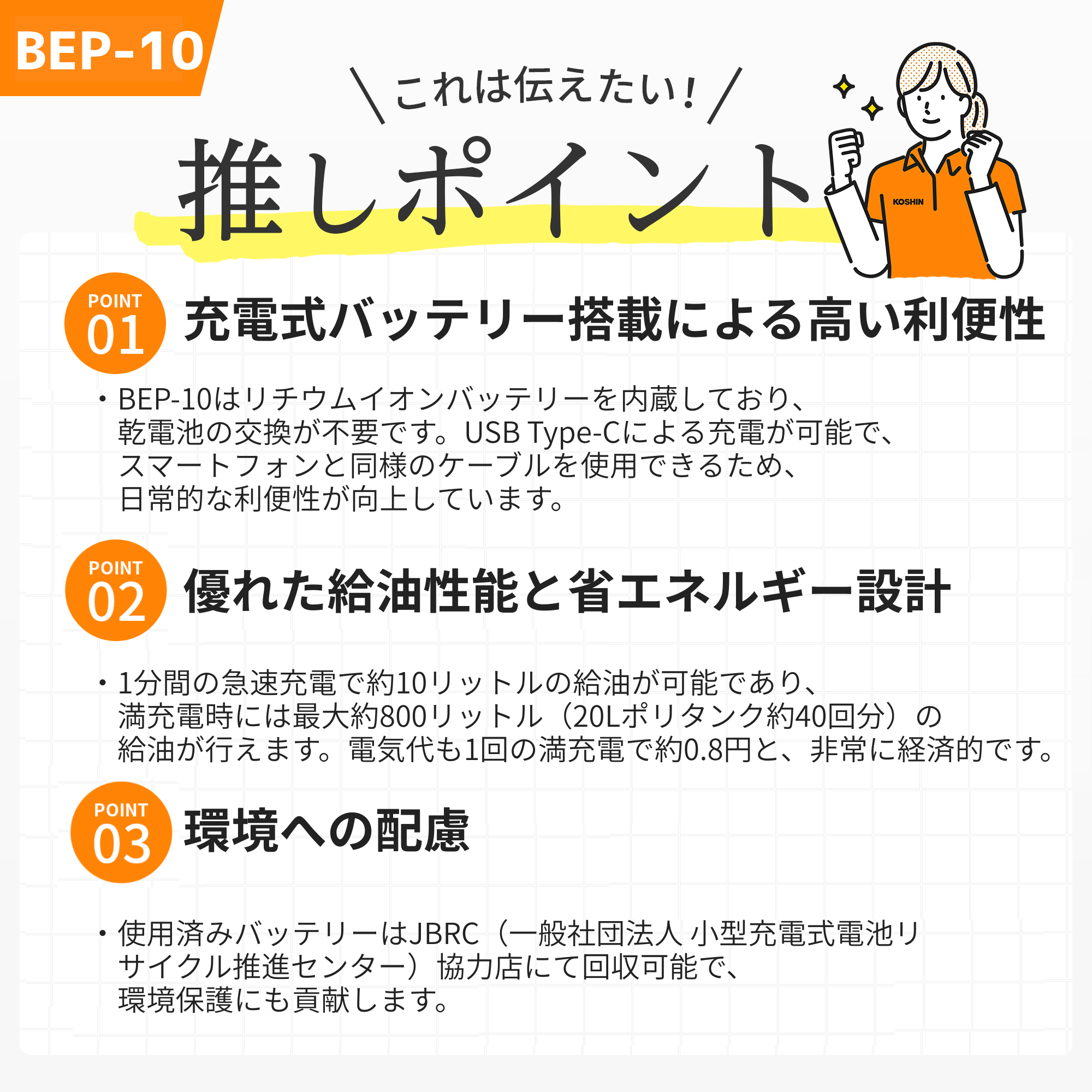 | 備考 | ※1:用途以外の目的に使用しないでください。使用不可液体例:ガソリン、第一石油類、A重油、溶剤、薬品、水など ※2:サイズが合わない器具には使わないでください 。(JIS規格推奨・認定マーク付き灯油かん推奨) ※3:JIS S 2037 流量試験法による。 ※4:内蔵電池を含む。 ※5:USB充電ケーブルは本製品の充電以外に使用しないでください。本製品と推奨USB充電器以外の動作確認は行っていません。(2025年5月現在) |