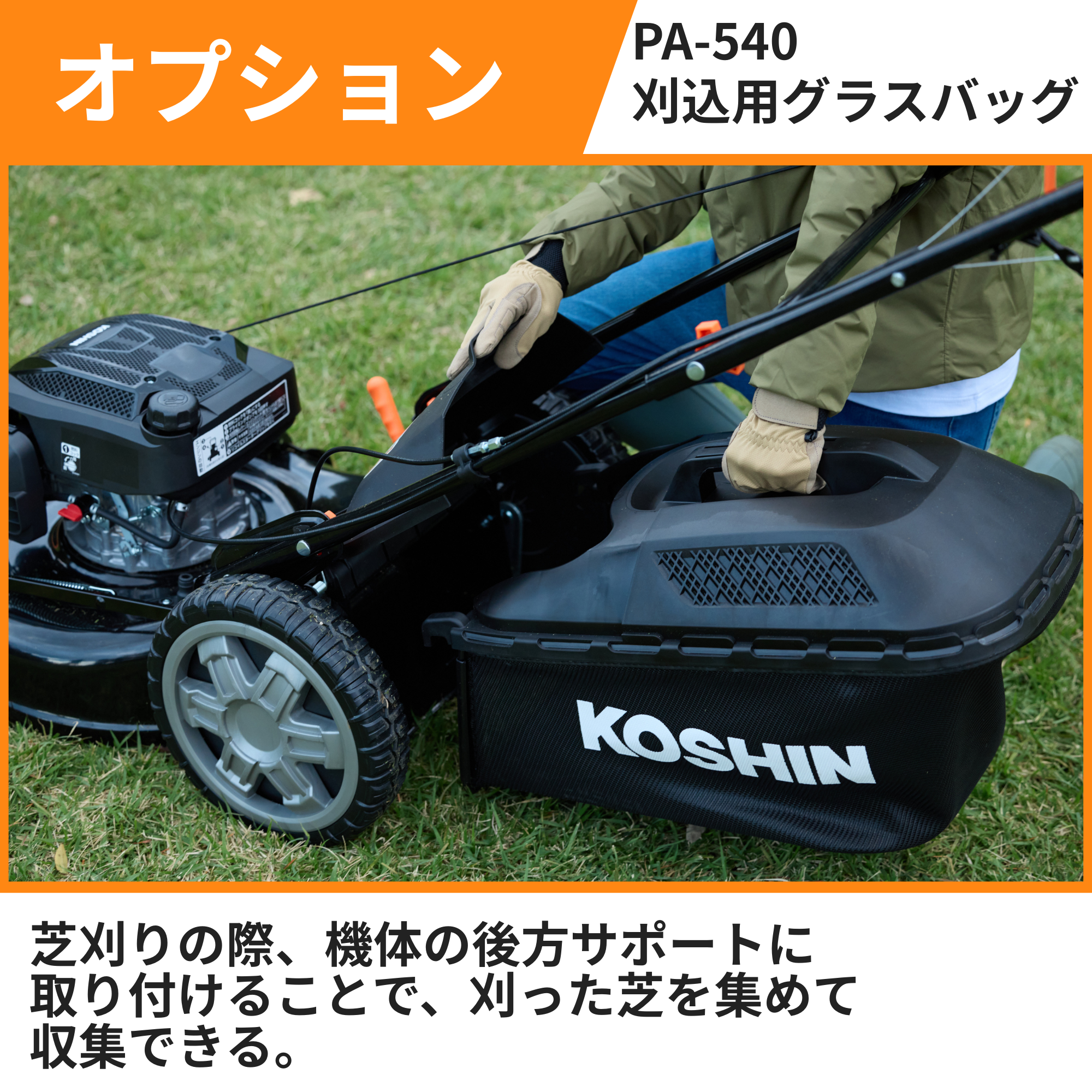 | 備考 | ・芝刈り時に使用すると便利なグラスバッグは付属していません。 必要に応じて「PA-540 グラスバッグ」をお買い求めください。 ※1:お客様にてVベルトの交換、ミッションケースのグリス交換は行えません。 刈刃(オプションパーツPA-541:フリー替刃)の交換には、専用工具と整備技術が必要です。刈刃を取り外す、または取り付ける際は、必ず整備技術を持った方が作業してください。お客様による刈刃の交換が難しい場合は、工進修理受付窓口へご相談下さい。 ※2:給油限界位置(給油口から約2cm下、出っ張りのところ)まで入れたときの値です。 ※3:お使いの地域の平均気温が表記の範囲内であれば、図に示された他の粘度のオイルを用いることができます。 ※4:上限の値です。 ※5:サイド排出ダクトを含まない値です。 |